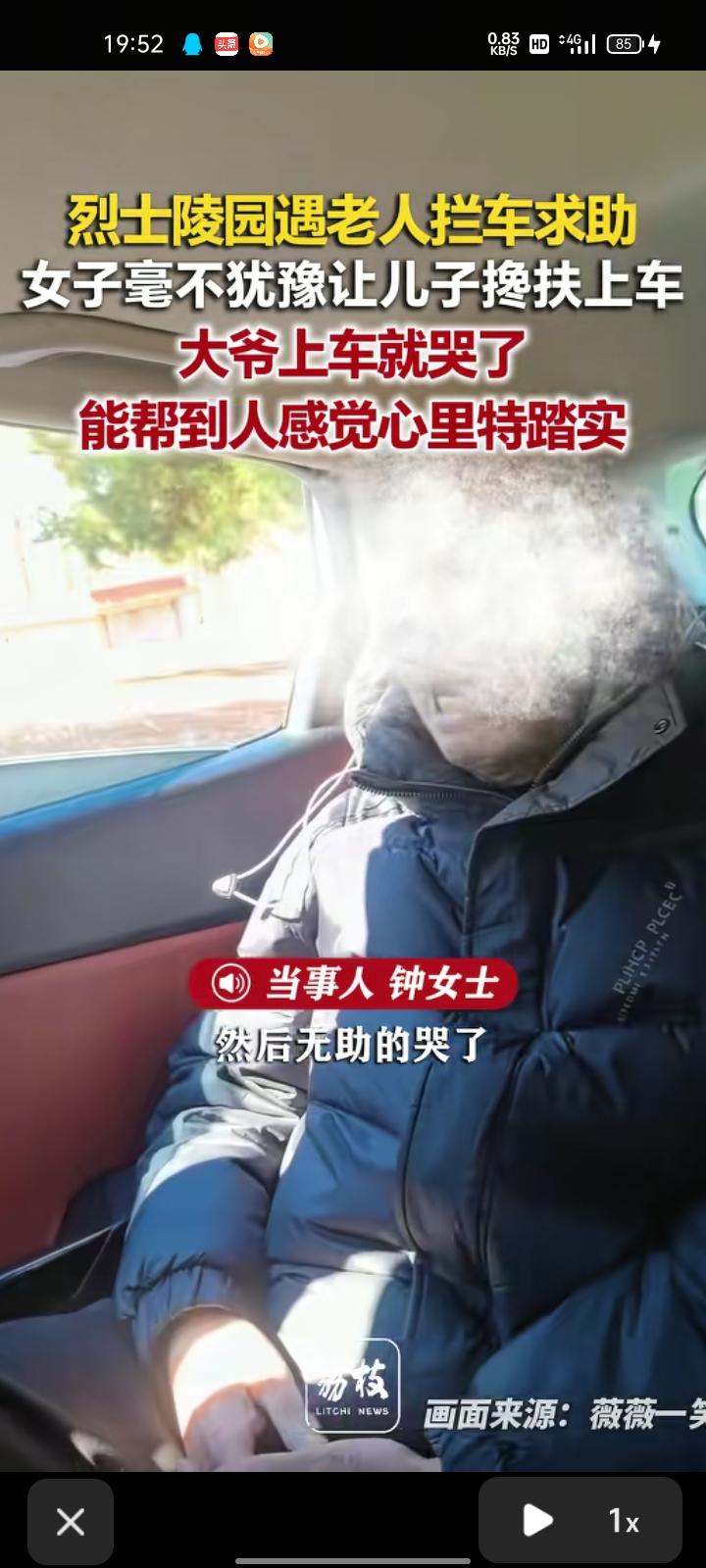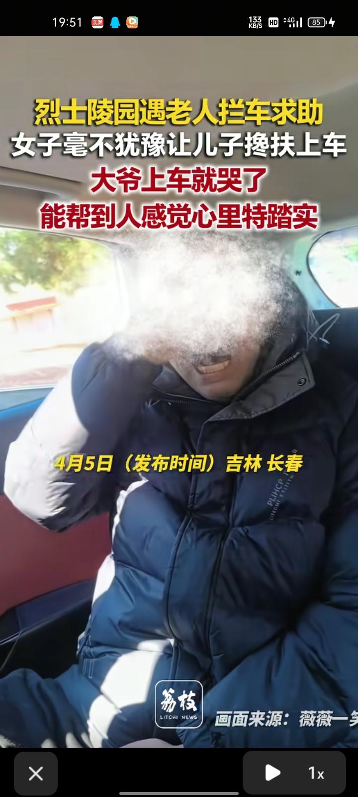 4月4日,吉林长春。钟女士称,在烈士陵园,有位大爷坐在路边,大妈向他们招手求助,她就让儿子搀扶老人上车。大爷说拦了很多车都没给他们停,然后无助的哭了。事后觉得,能在这个庄严肃穆的烈士陵园里做好事,感觉内心非常踏实