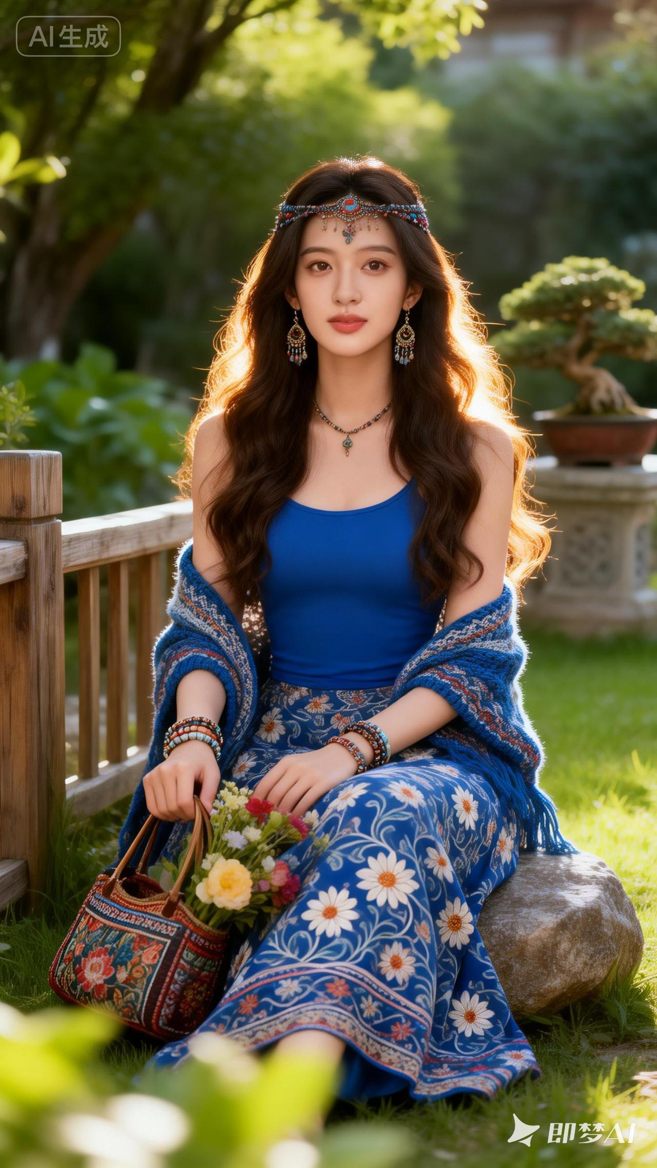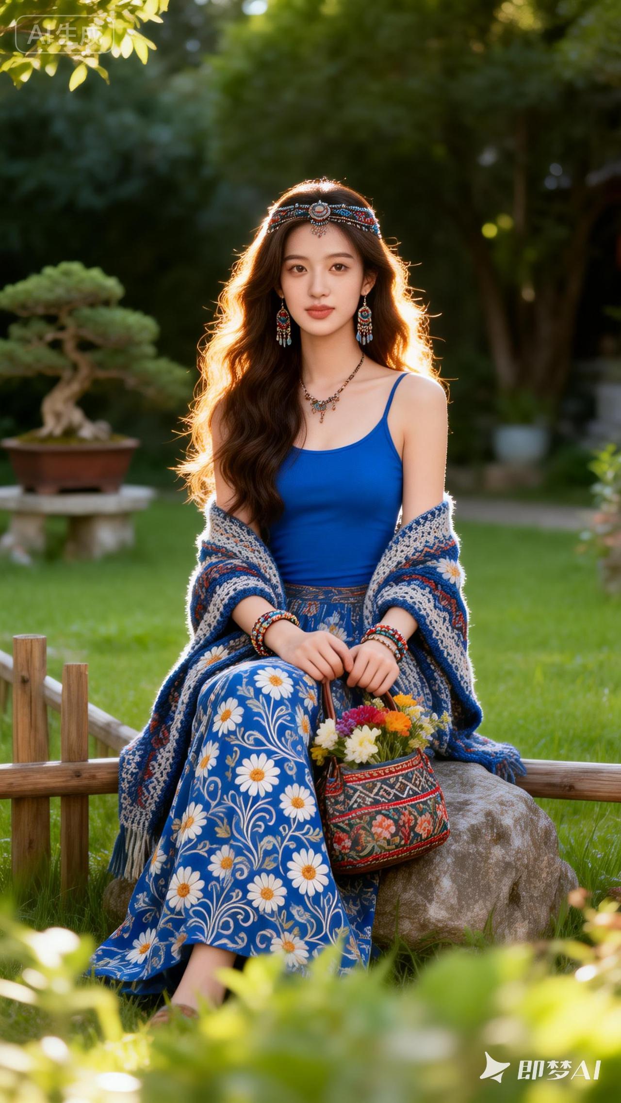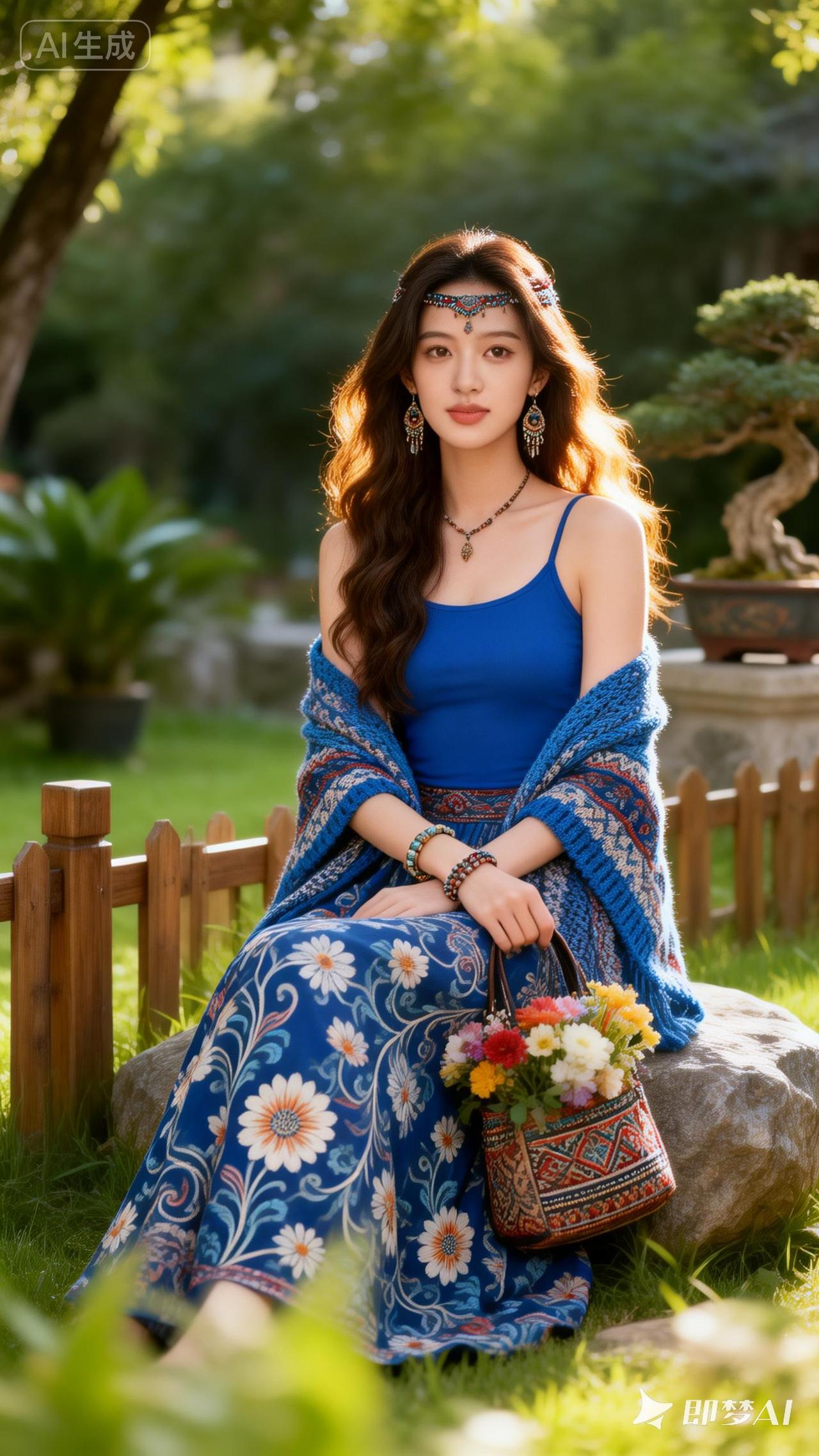 夏日风情,蓝裙飘逸,花海相伴,悠然自得。