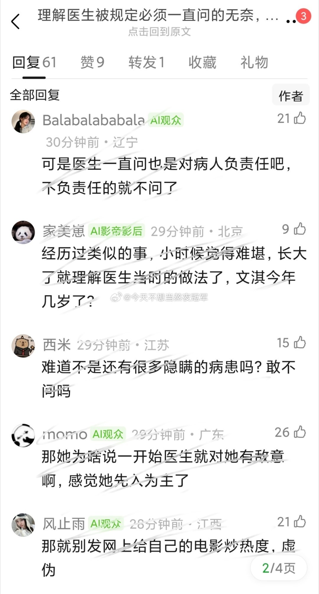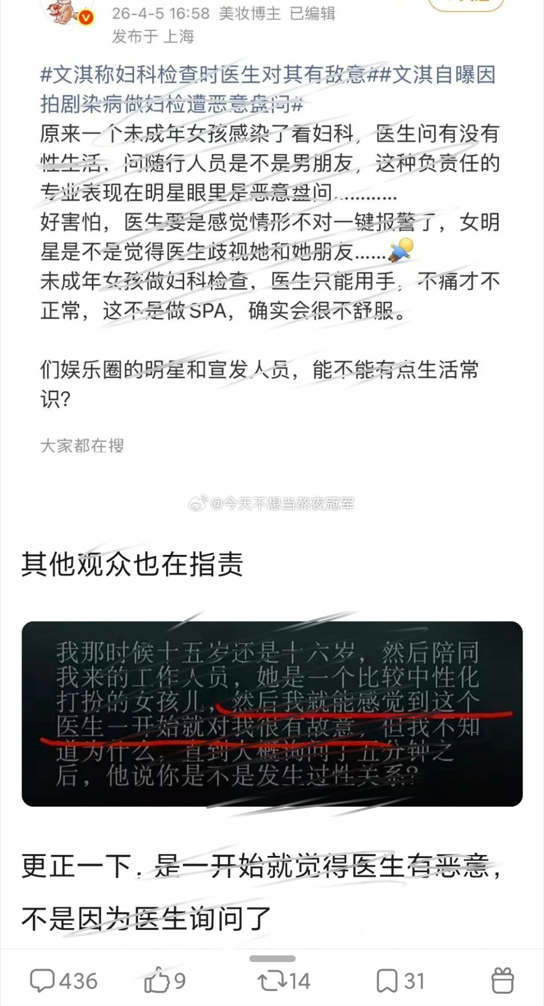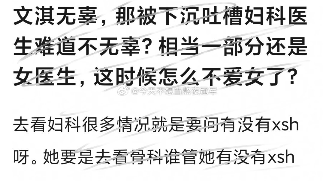 网友觉得医生正常的问诊流程在文淇看来就是对患者的敌意,让本就紧张的医患关系雪上加霜加上之前文琪还说过“羡慕中女,年轻的女演员机会越来越少”,认为文淇频频cue女👊🏻话题炒 作意味太浓了。。。🤔文淇称妇科检查时医生对其有敌意