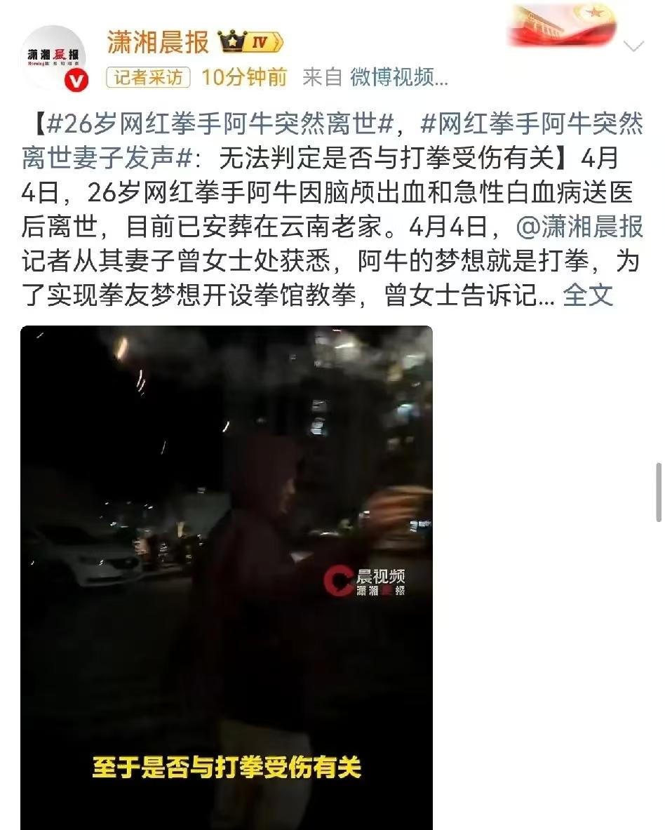 阿牛,真名田岩映,云南临沧佤族小伙,怀揣着打拳的梦想只身闯荡广州,靠自己的努力开了一家格斗馆,是网红圈公认的“草根追梦”硬汉。可谁也没想到,死神来得这么突然。4月4日凌晨,他在拳馆内突发不适昏迷,送医后被诊断为脑颅出血合并急性白血病,病情爆发迅猛,傍晚就抢救无效离开了人世。