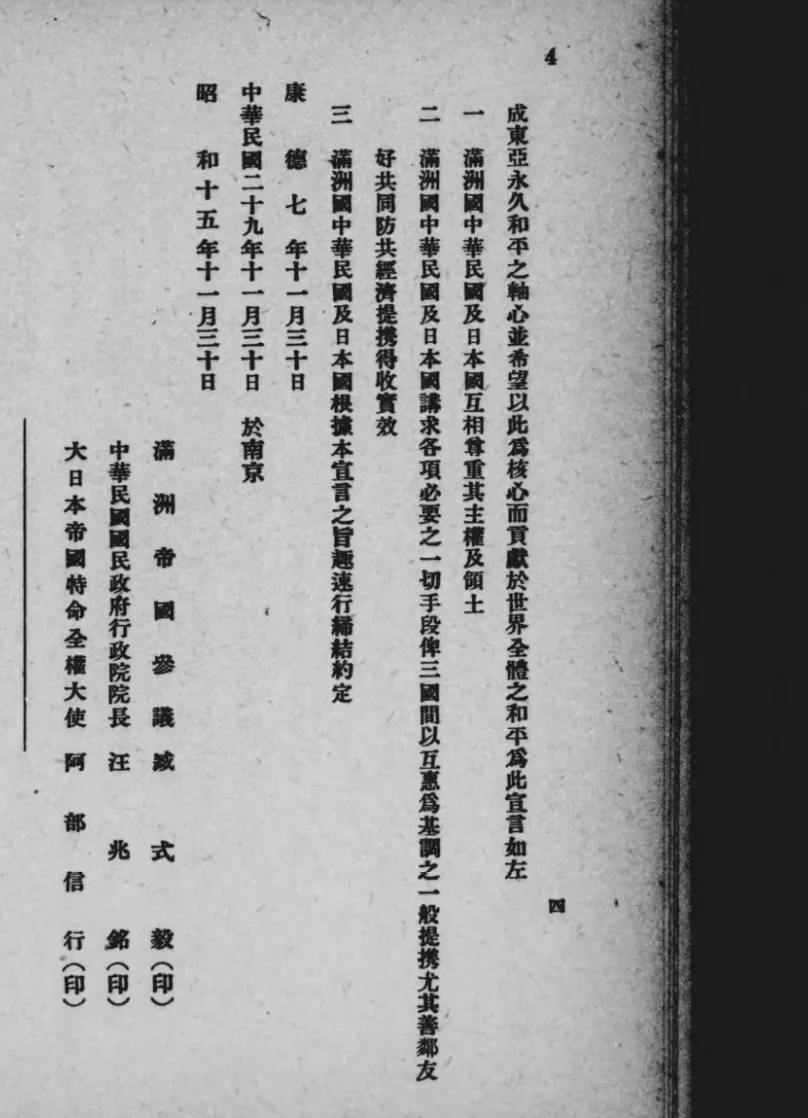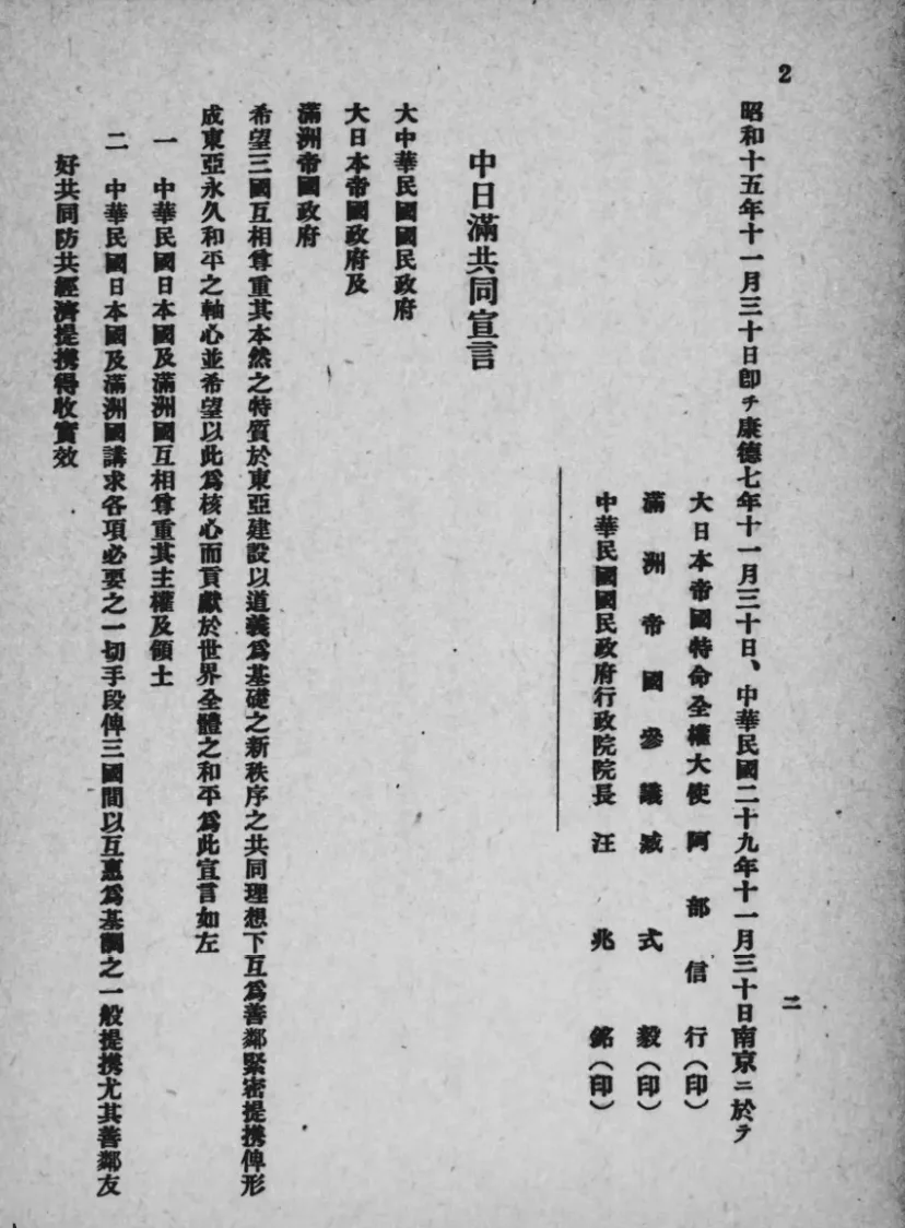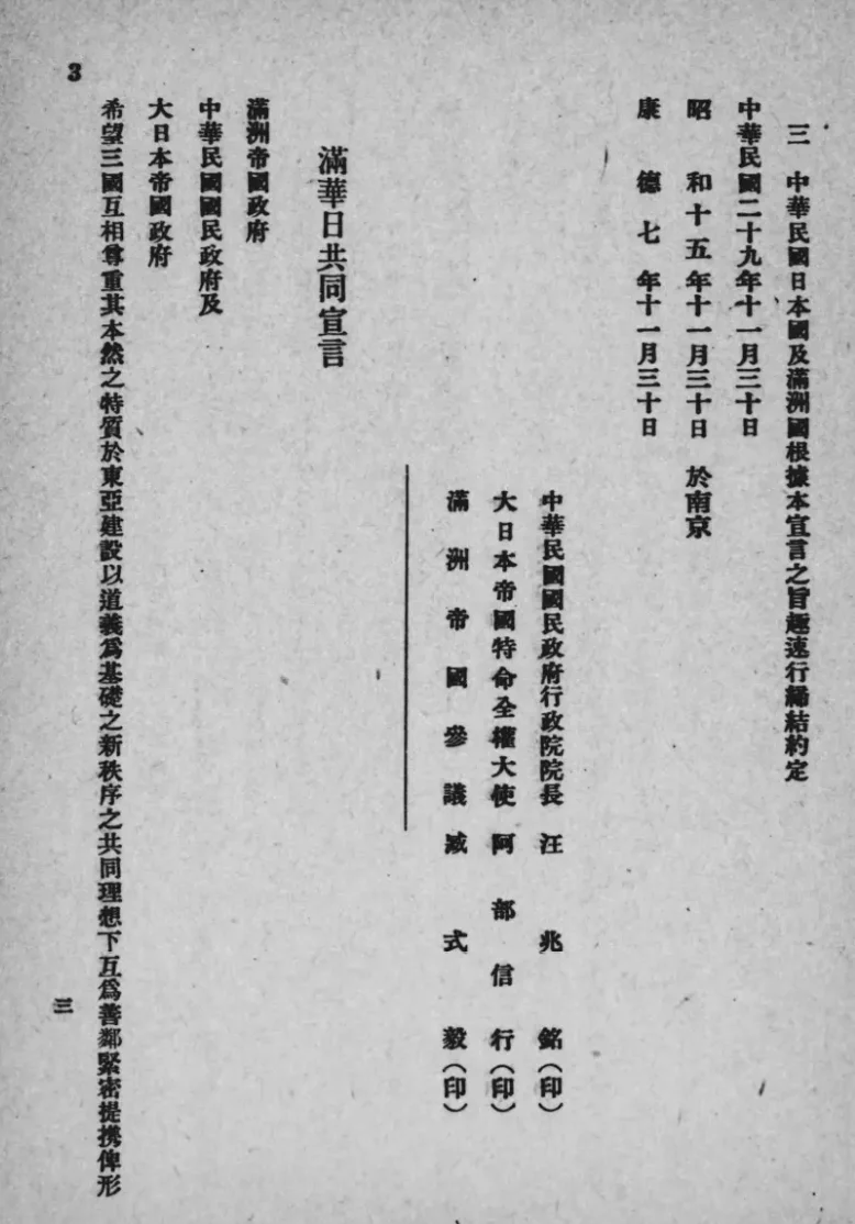 1940年,56岁,作为伪满“全权代表”访问南京,与汪精卫伪政权签订所谓“共同宣言”,进行卖国求荣的“外交”活动。