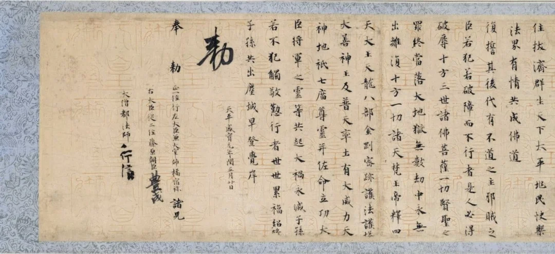 🌈文书下方有三位当时重臣的署名,包括左大臣橘诸兄、右大臣藤原丰成、大僧都行信,真实反映了当时的政治与宗教权力结构。