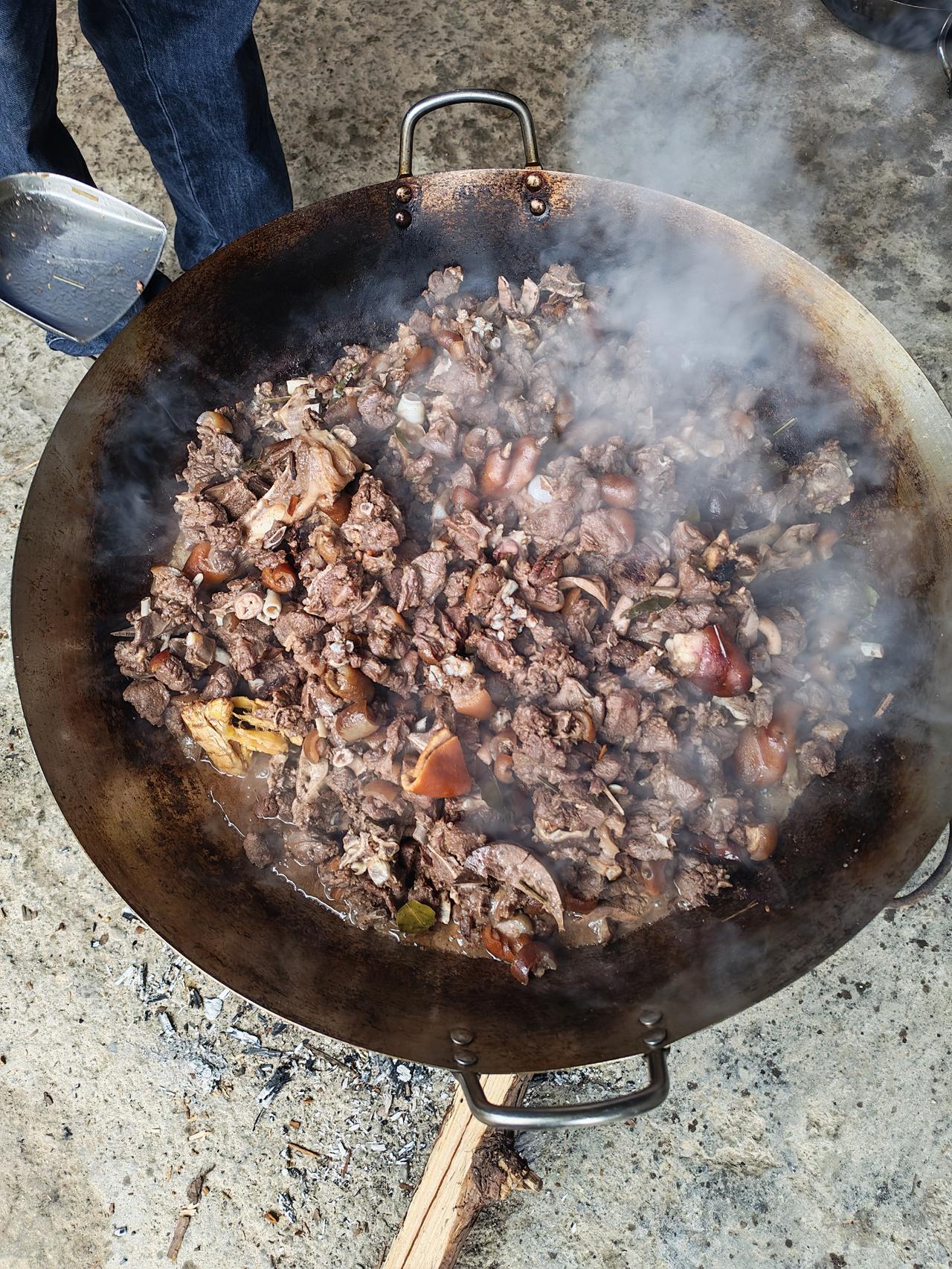 用柴火大锅慢炖的本地土狗肉,铁锅一炒,烟火一冒,香气直接飘满整个院子。