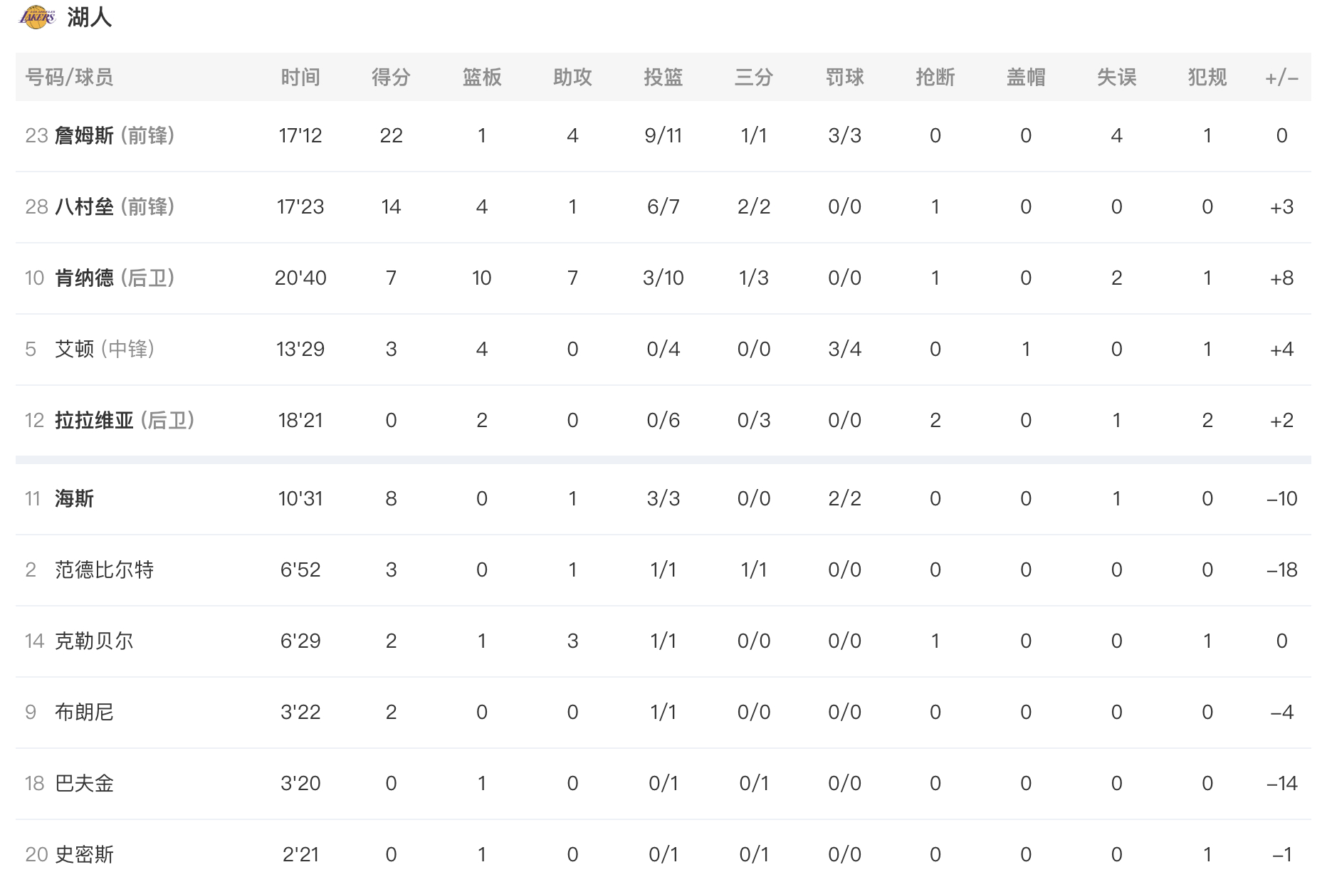 詹姆斯22分1篮板4助攻,八村14分4篮板1助攻,肯纳德7分10篮板7助攻,艾顿3分4篮板,海斯8分,范德彪3分,克勒贝尔2分3篮板,布朗尼2分,拉拉维亚2篮板2抢断。
