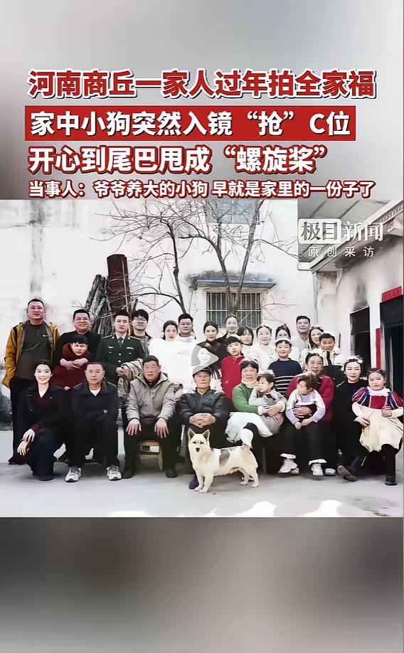 事情是这样的,这家人就是商丘本地的普通家庭,平时一家人聚在一起的时间不多,这次好不容易凑齐了,就想着拍一张全家福留作纪念,爷爷特意把自己养了很久的小狗也带在了身边,没想着它能配合拍照,就当是让它凑个热闹。