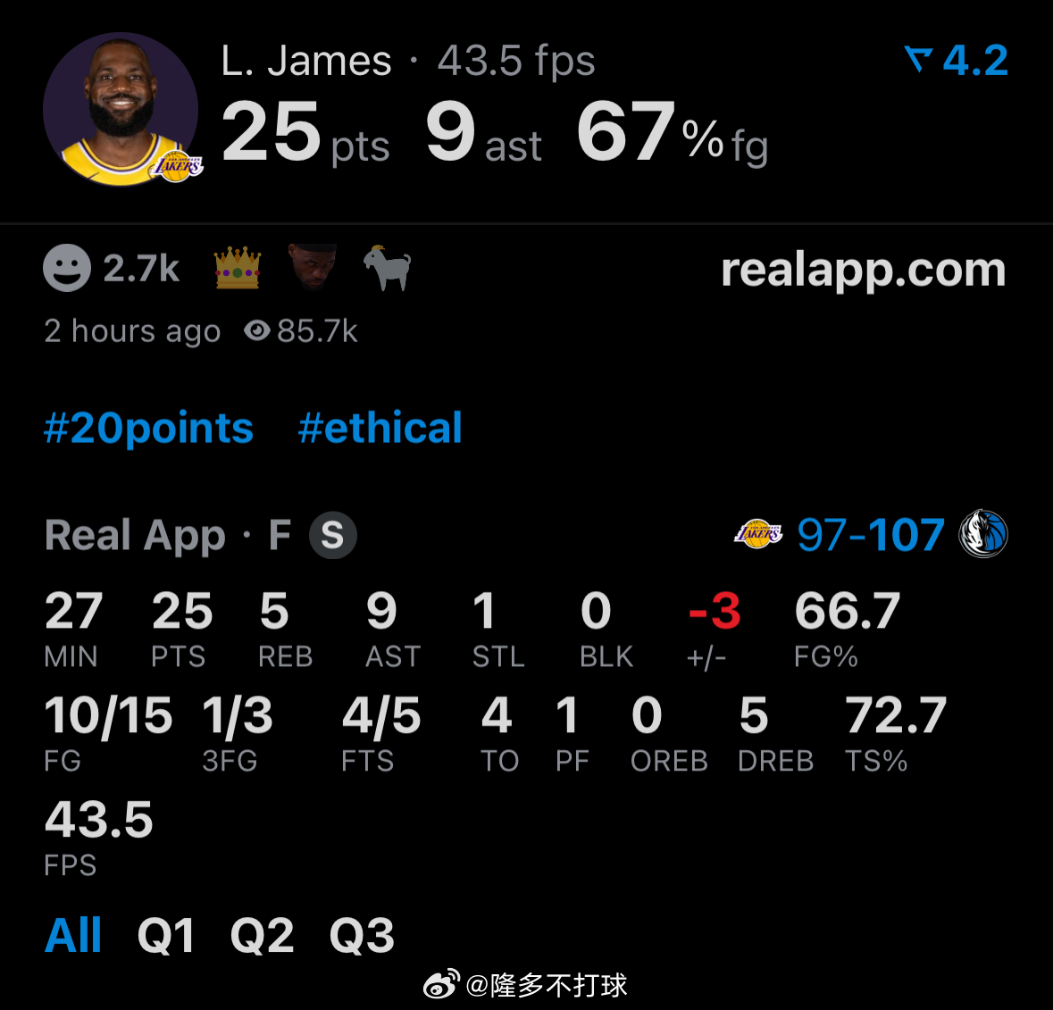 三节结束,湖人落后西部第十三独行侠10分。詹姆斯25分4失误,正负值-3湖人vs