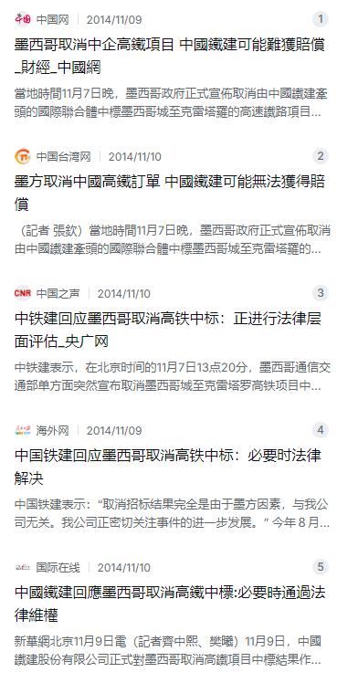 11月7日,墨西哥政府突然宣布取消中标结果。给出的理由是“投标方只有一家,缺乏竞争性和透明度”。但明眼人都看得出来,这背后真正的原因是墨西哥国内政治斗争。反对党抓住这个项目大做文章,指控当时的总统涅托政府与中标的墨西哥本地企业存在利益输送,闹得满城风雨。涅托政府顶不住压力,只好拿中方企业开刀,把已经到手的合同硬生生撤了。