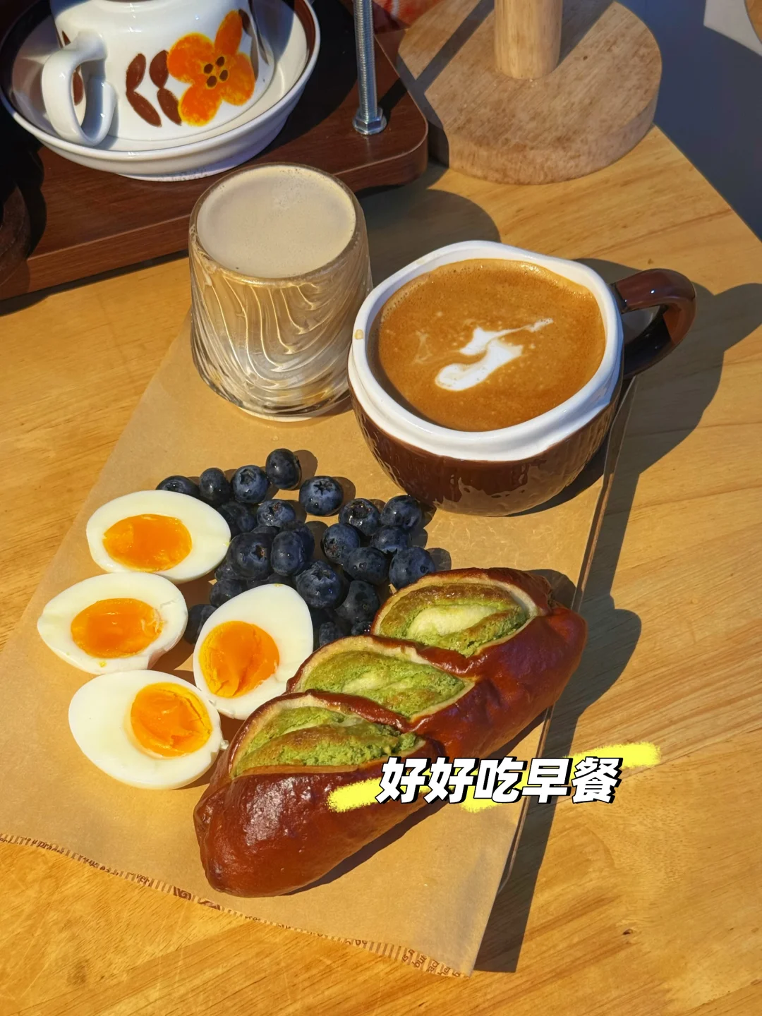 早餐:2个水煮蛋➕2杯咖啡➕一个碱水面包
