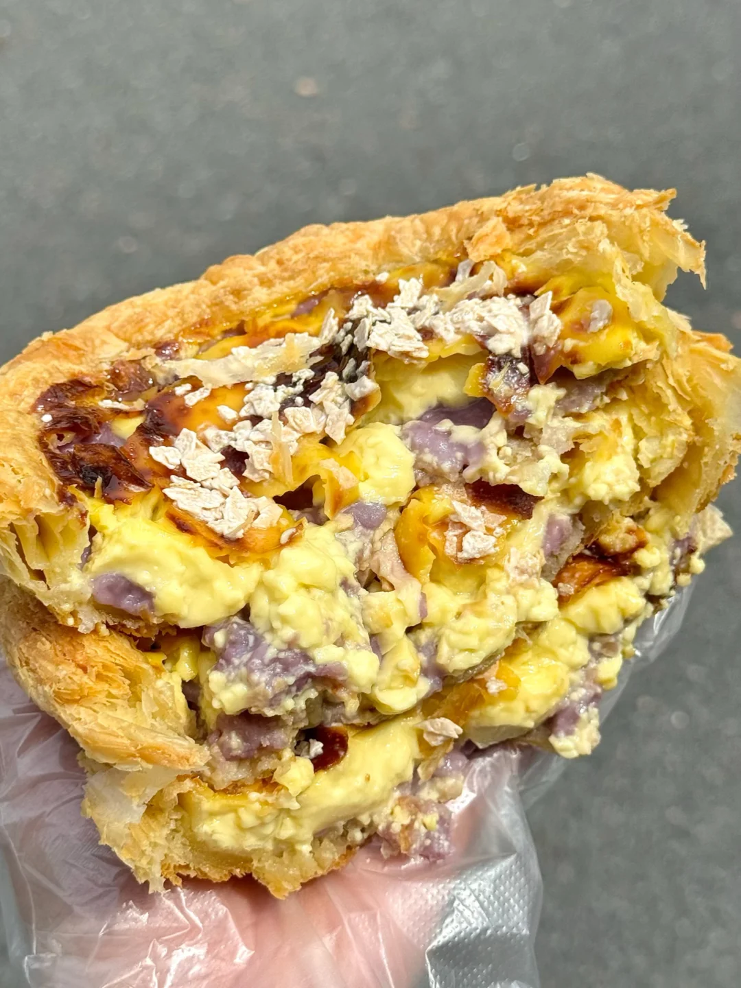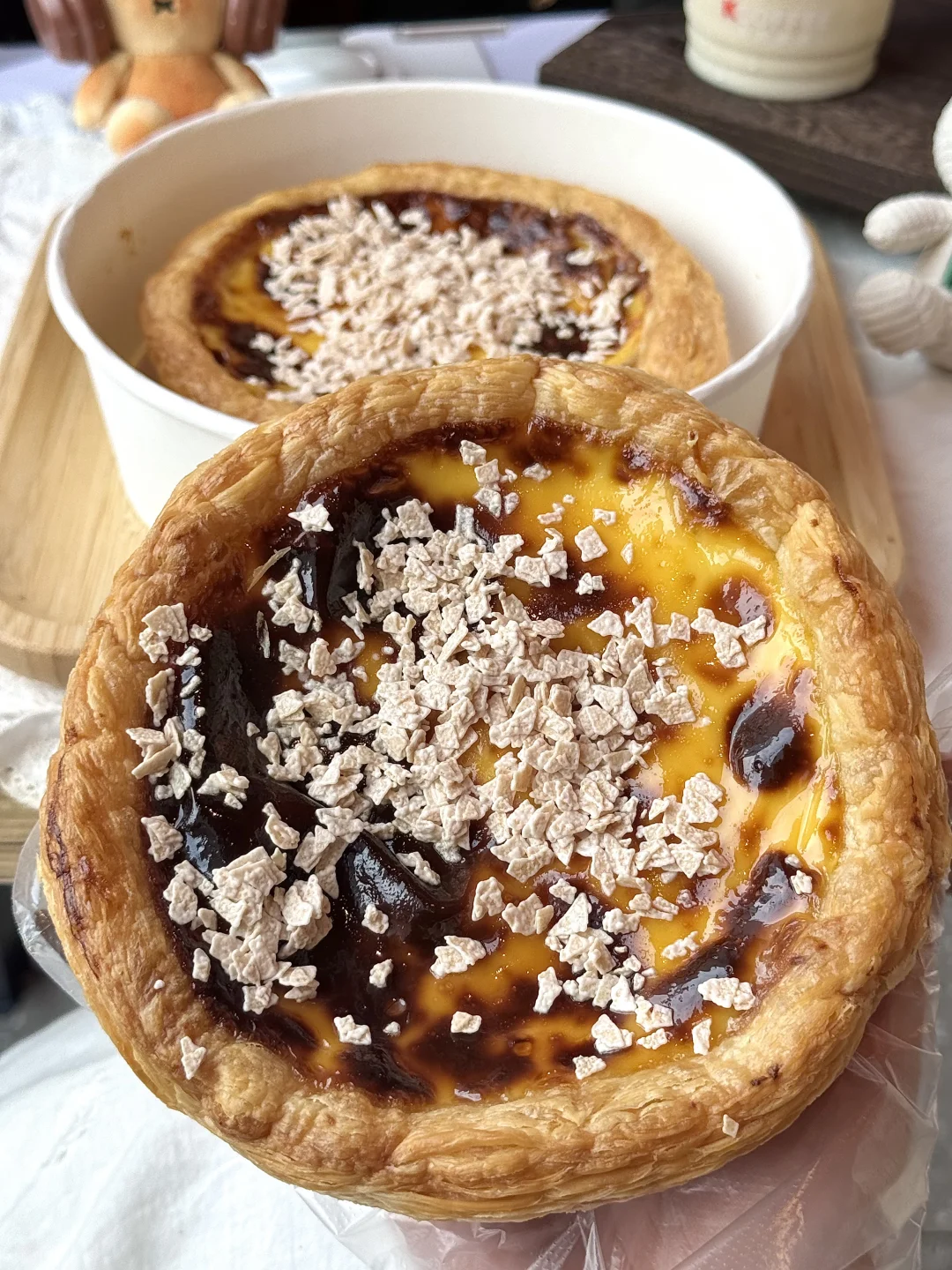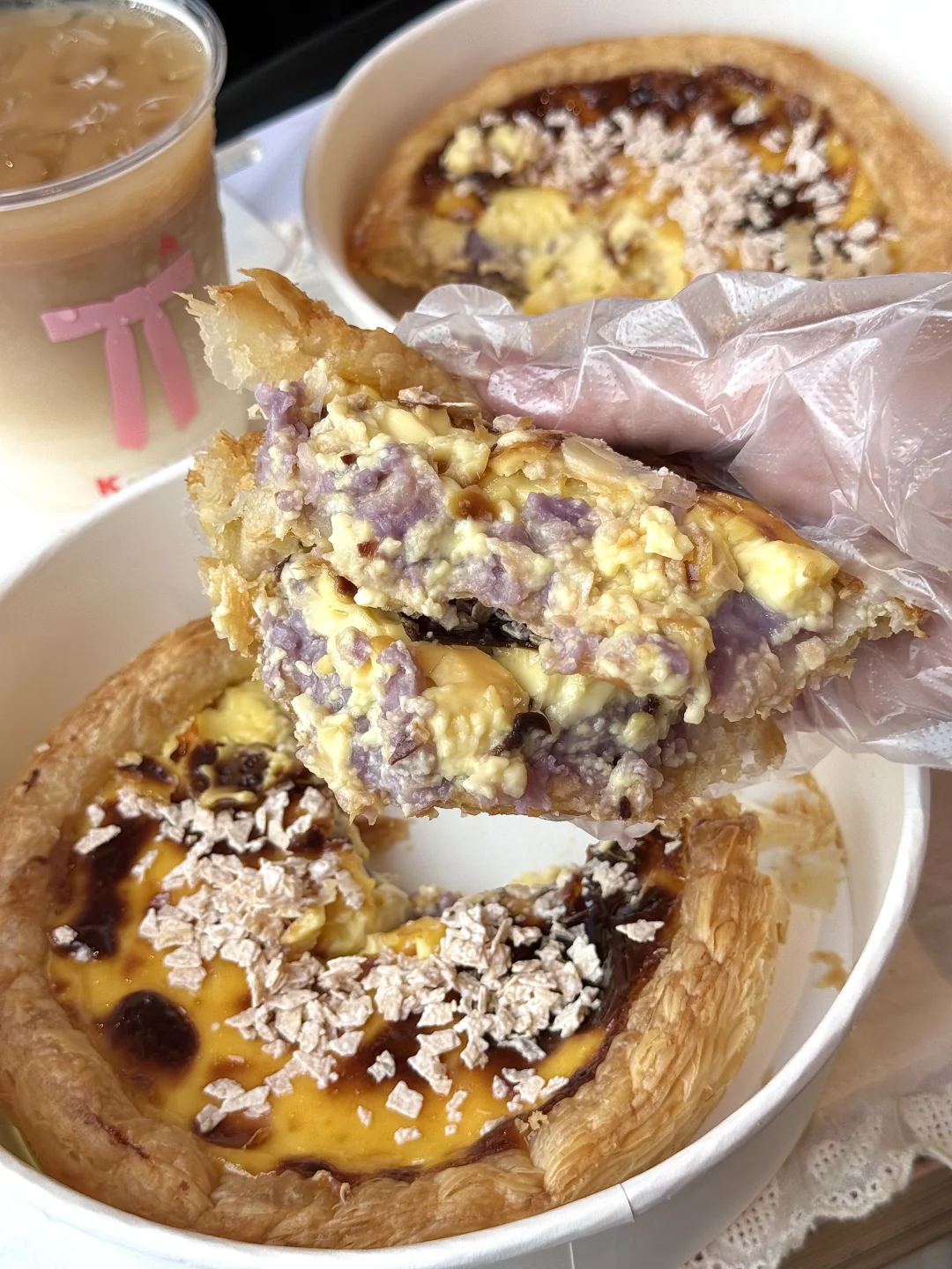 这次顶部撒满了椰子脆片,咬起来咔滋咔滋的,满嘴都是椰子香~酥脆的蛋挞皮搭配浓郁的芋头内陷…