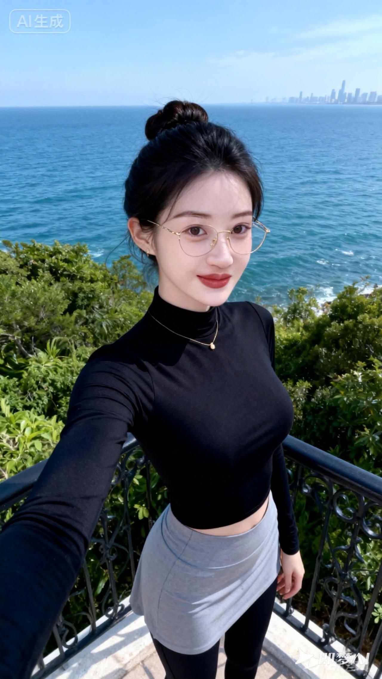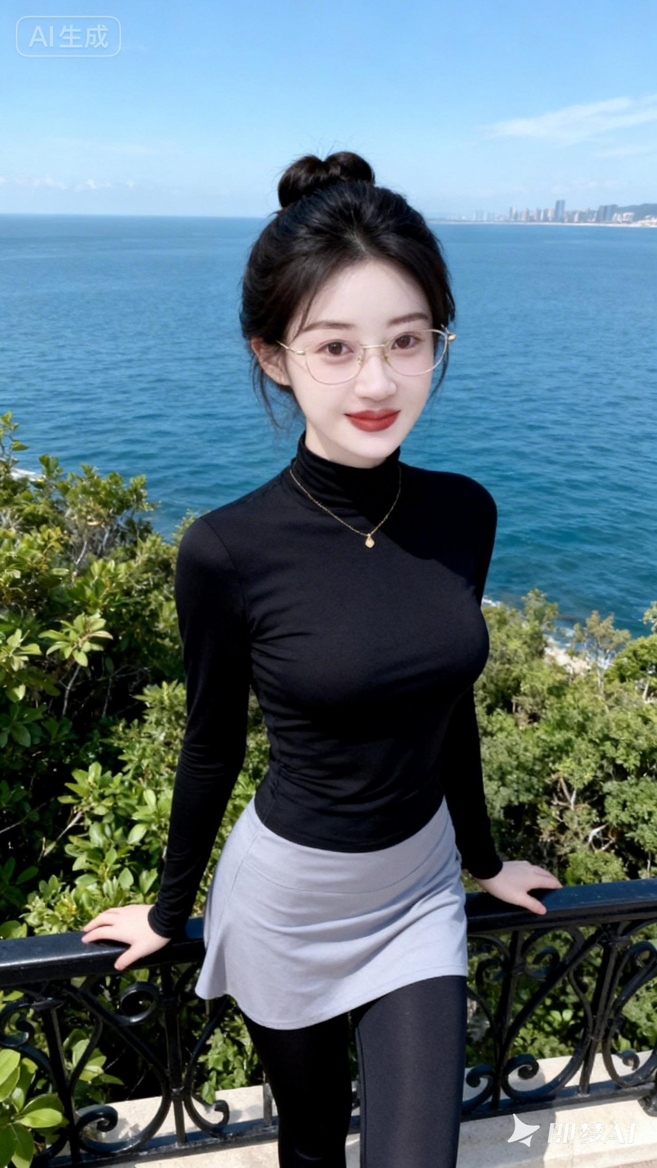 海边度假穿搭,黑色高领衫+灰色短裙,清新自然,完美搭配!🌊👗💄