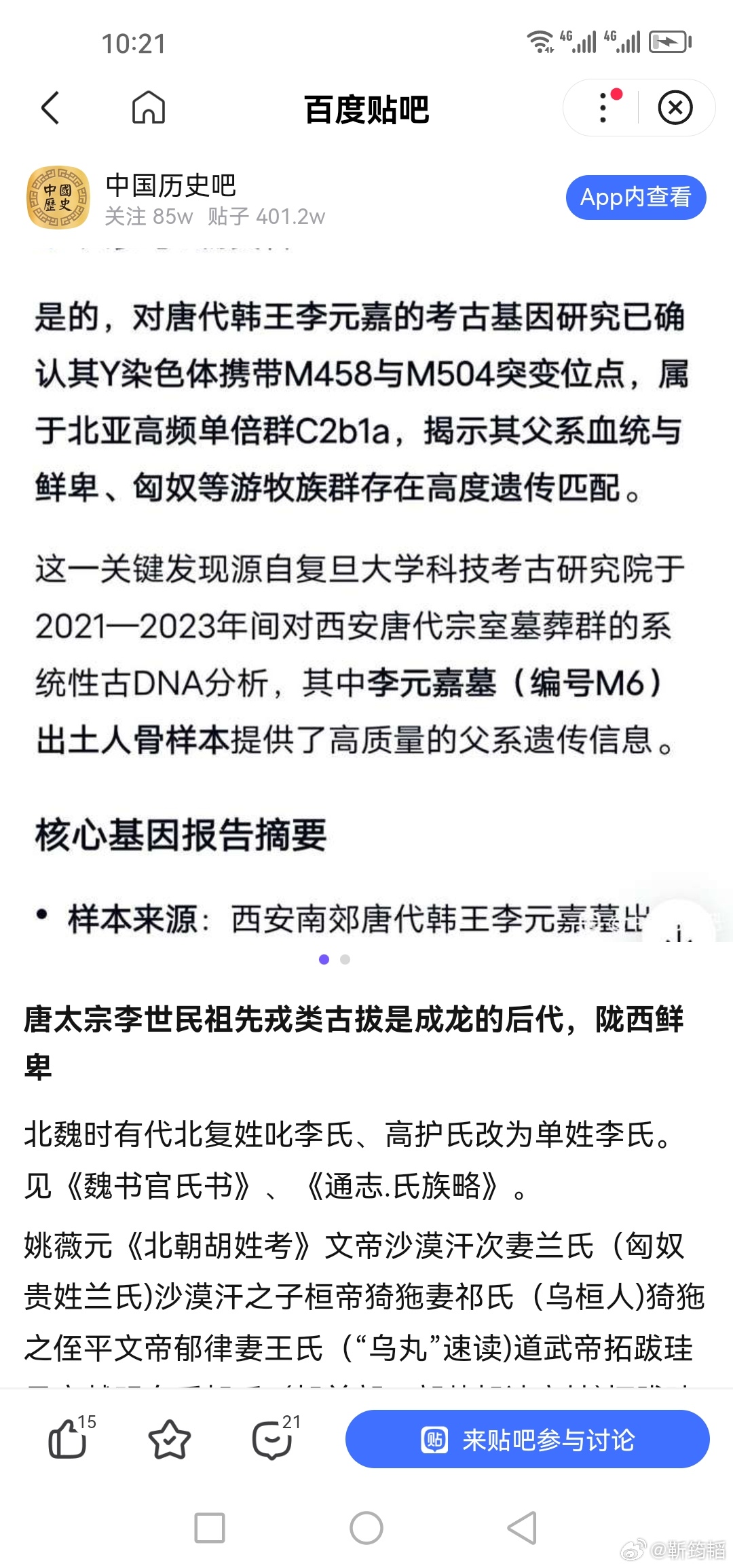北魏时有代北复姓叱李氏、高护氏改为单姓李氏。见《魏书官氏书》、《通志.氏族略》。姚薇元《北朝胡姓考》文帝沙漠汗次妻兰氏(匈奴贵姓兰氏)沙漠汗之子桓帝猗狏妻祁氏(乌桓人)猗狏之侄平文帝郁律妻王氏(“乌丸”速读)道武帝拓跋珪母亲献明皇后贺氏(贺兰部,部帅贺讷之妹)拓跋珪妻刘氏(独孤部部帅刘眷女)道武帝死于409年,就是说拓跋鲜卑在496年孝文帝令将鲜卑多音复姓改单音汉字前,就已经有改单姓的现象。李虎赐姓大野氏是事实?但他原来是否为汉人则值得怀疑。叱李——高户→李→大野氏→李氏(李渊)拓拔→普乃→周→车非→周(周摇)《魏书》后自卢氏入寇弘农,执太守李拔等,遂逼陕城.时秦州刺史杜道生讨安都.仍执拔等南遁,及世祖(拓跋焘)临江,拔乃得还。《宋书》李买得,古拔子也,为虏永昌王长史,勇冠戎类。永昌(北魏永昌王拓跋健)闻其死,若失左右手。北魏太武帝拓跋焘认南凉王子秃发破羌与己同源,赐姓“源”,其后裔唐朝宰相源乾曜。陈寅恪《隋唐制度渊源略论稿》里提到源氏虽出河西戎类,然其家世深染汉化。那么宋书里戎类李买得既指鲜卑人。刘学铫提出不要将「李初古拔」(两《唐书》将之附會为虚拟之李重耳)之「李」看作姓氏之李。「李初古拔」为胡语之音译,而非「李.初古拔」石锡铭著《陇西国志》依土尔扈特族源世谱,断定李世民为乞伏成龙之后。李元嘉是唐高祖李渊的第十一子,生于619年,母亲是宇文昭仪。来源于近年来多项针对唐代贵族墓葬遗骸的古DNA分析研究,其中最具代表性的是复旦大学团队于2021年发表的《唐代宗室遗骸DNA分析》。该研究对西安唐代韩王李元嘉墓出土的人骨进行了父系Y染色体检测,结果显示其属于北亚高频单倍群C2b1a,该类型与蒙古国诺彦乌拉匈奴贵族墓地的基因样本高度匹配,研究团队据此推断李唐皇室父系可能源自东胡-鲜卑系统。