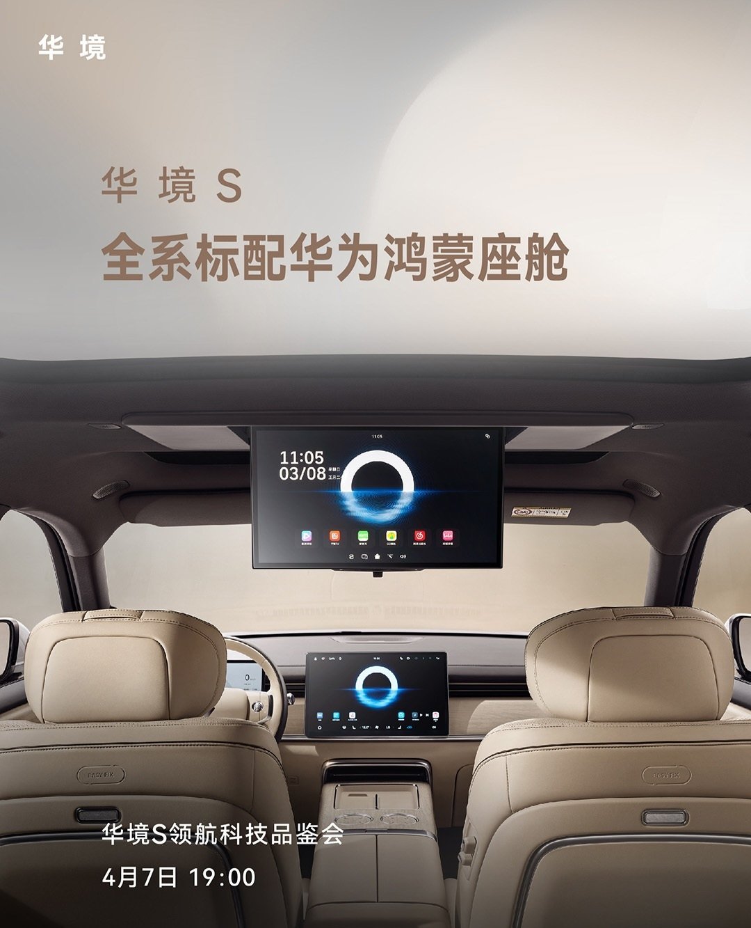 【华境 S 大六座 SUV 全系标配华为鸿蒙座舱,后排提供吸顶娱乐屏可选】