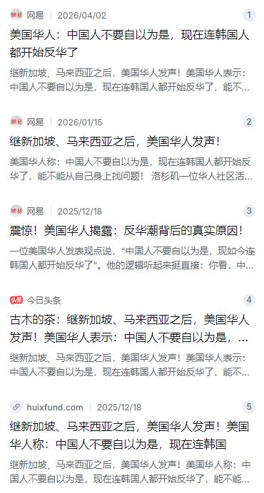 先捋一下事件的源头。大概从2025年下半年开始,陆续有新加坡和马来西亚的华人在社交媒体上表达了对中国外交姿态的看法,其中不少人认为中国在某些国际场合的处理方式不够成熟。到了2026年初,美国这边的华人也坐不住了。洛杉矶一位华人社区活动家在公开访谈中说了一番挺重的话,大意是有些中国人“别太自以为是了”,现在连韩国人都开始反华了,是不是该从自己身上找找原因。这段话很快在海外社交平台上炸开了锅,支持的反对的都有,但话题的热度一直没降下来。