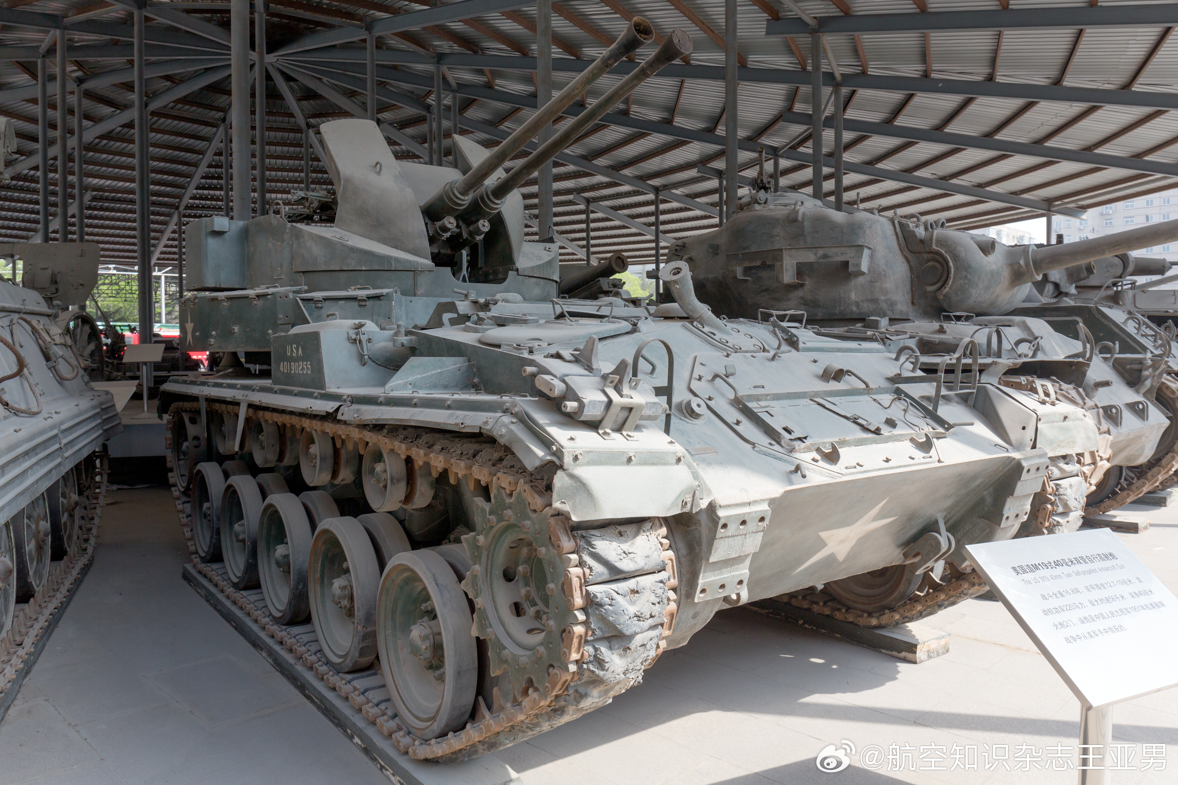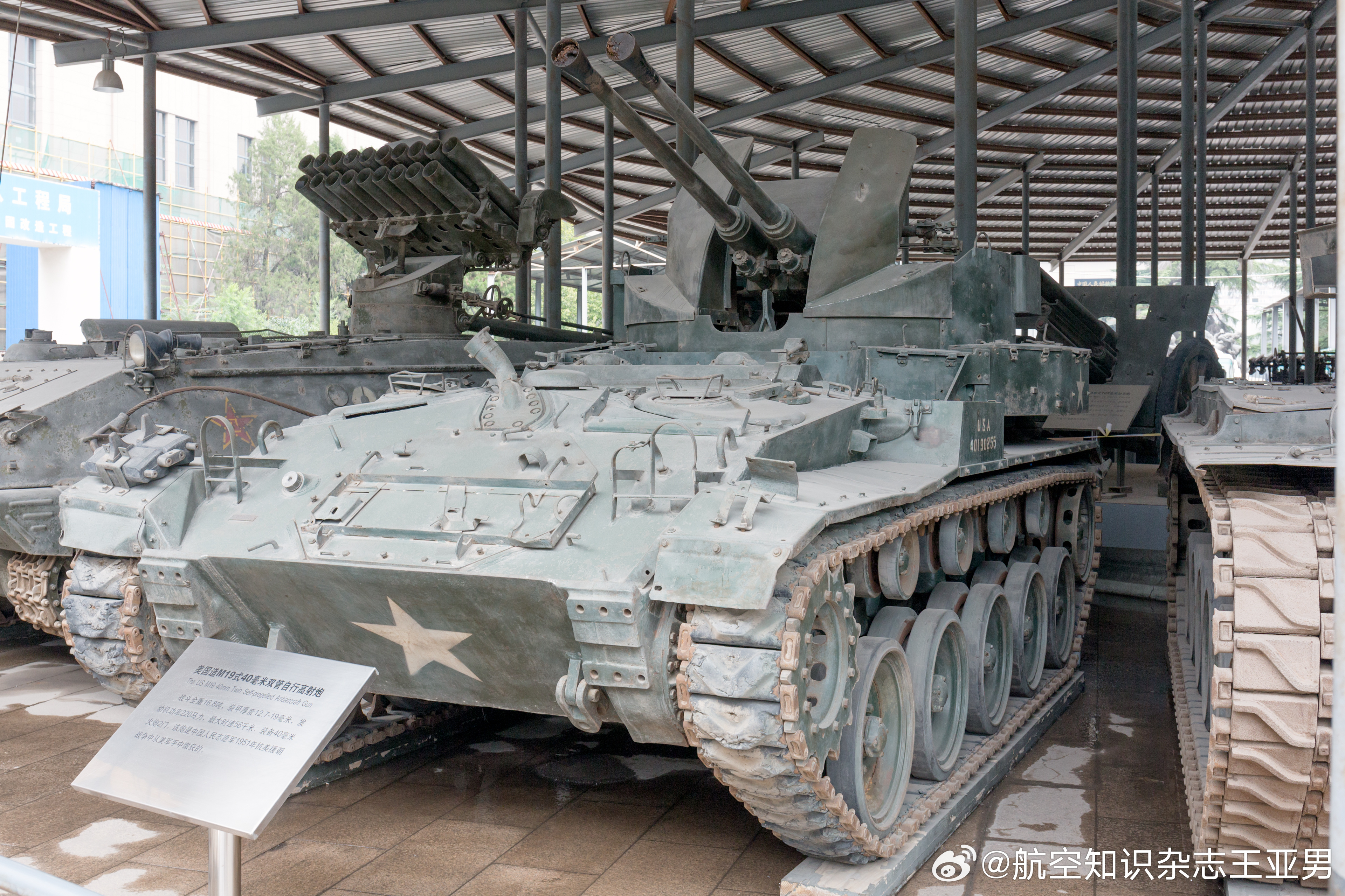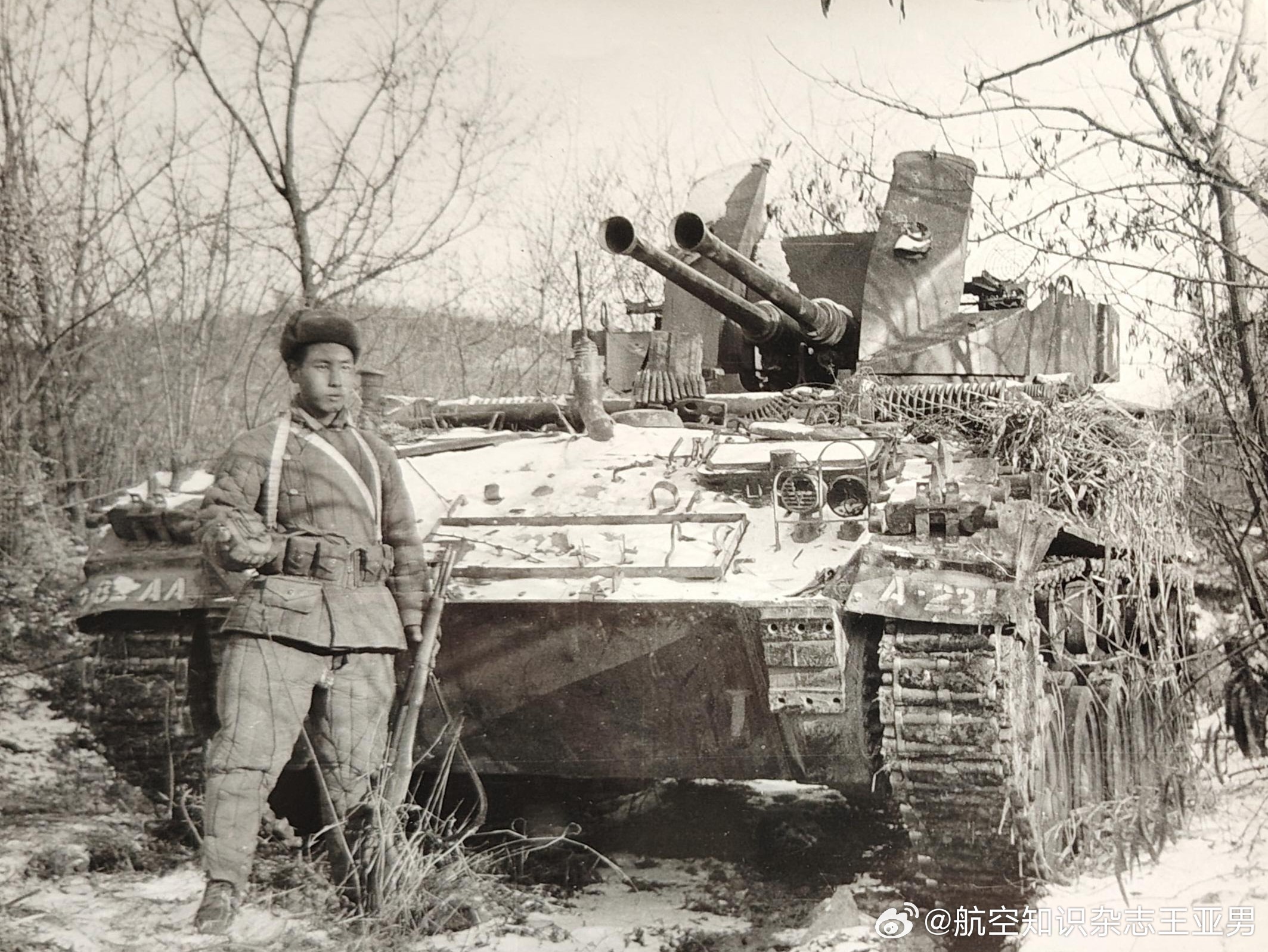 #航空创作计划# 中国士兵与M19这张照片据说拍摄于朝鲜战场:一位年轻的中国士兵站在缴获的美军M19自行防空高炮前,留下了这幅影像。士兵的左手拿着一支M1加兰德步枪,这同样是缴获美军的战利品,志愿军战士们挺喜欢这种半自动步枪,叫它做“大八粒”。士兵身后的这辆M19,是美军当时伴随野战防空的重要装备,采用M24“霞飞”坦克底盘,配备两门40毫米博福斯机炮,不仅能打击低空目标,必要时炮管放平,也能对地面工事等目标实施火力突击。对于中国士兵而言,这种带铁脚板的自行式双管速射高炮是非常新奇的东西——中国军队还没有如此奢侈的家伙。在前线激烈交火的地带,制空权完全掌握在美军手中。然而,美军想要改变战场态势,最终还得在地面与志愿军一寸一寸地争夺,他们在战斗中发现志愿军的战斗力无法通过所谓装备评价法来衡量,志愿军把人的意志和力量发挥到了难以想象的程度,美军一次次在志愿军面前碰壁甚至溃退,不少装备沦为志愿军的战利品。如今在北京军事博物馆就保存有一辆M19,只是不知道是否就是照片里这一辆。