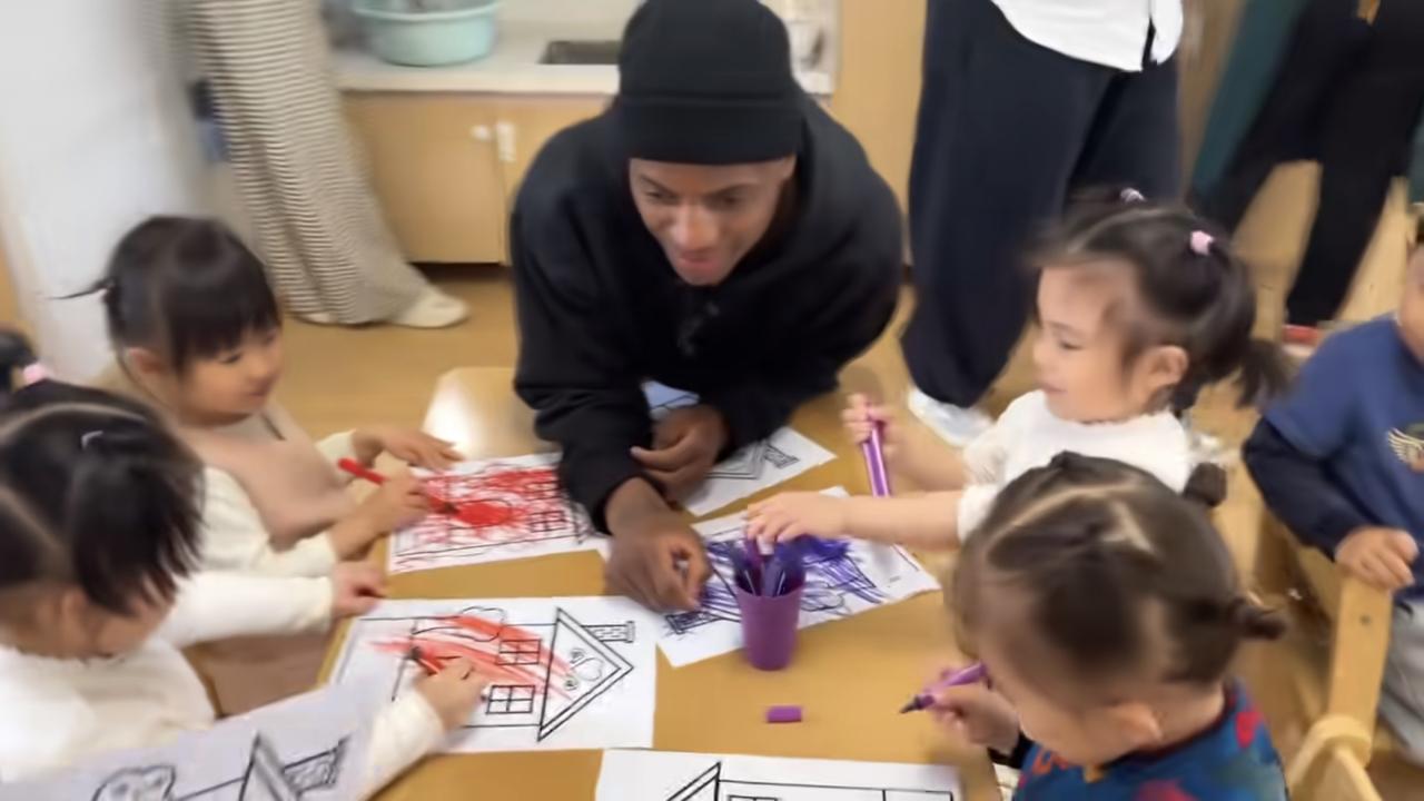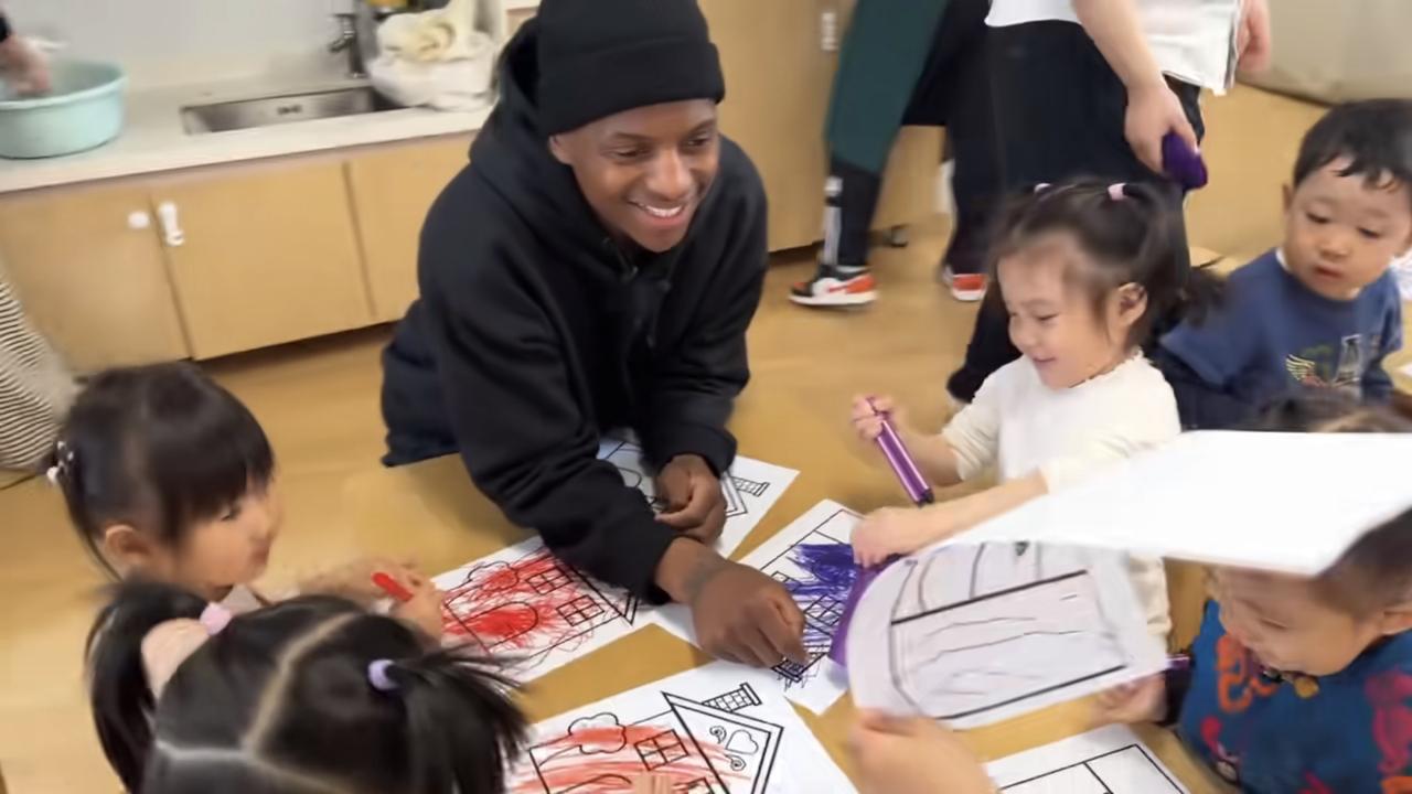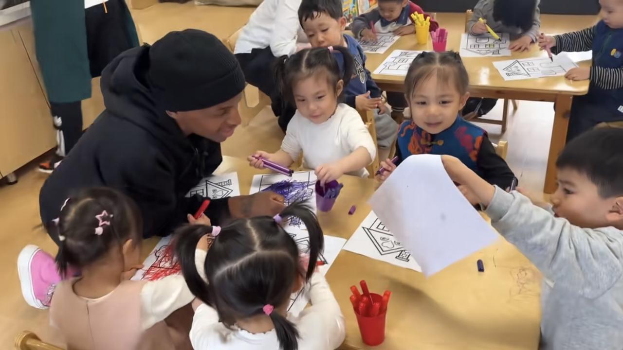 某地幼儿园专门请黑人外教来教小朋友画画艺术,只见这位黑人外教让孩子们围到桌子旁边