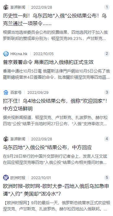 先说说公投这事儿。 2022年9月,顿涅茨克、卢甘斯克、扎波罗热和赫尔松四地搞了一场入俄公投。根据当地选举委员会公布的数据,四地支持加入俄罗斯的比例分别是:顿涅茨克99.23%,卢甘斯克98.42%,扎波罗热93.11%,赫尔松87.05%。投票率也都超过了法律规定的50%门槛。