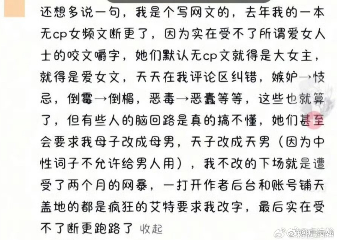首先,最毒妇人心这样涉及女性的负面词汇,是厌女,这个应该容易理解,女作者不得使用这些词汇。