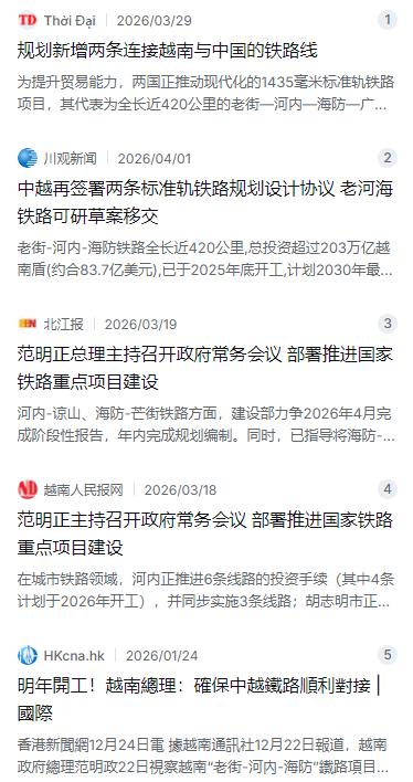 先看越南。2026年越南政府明确表态,要全力推进三条中越跨境标准轨铁路建设,全面采用国际通用的1435毫米标准轨。其中最引人注目的是老街—河内—海防铁路,全长约390公里,投资约77亿美元,已在2025年底动工,计划最晚2030年完工。建成后从云南到越南北部沿海,全程不用换轨,客货运输直达港口。