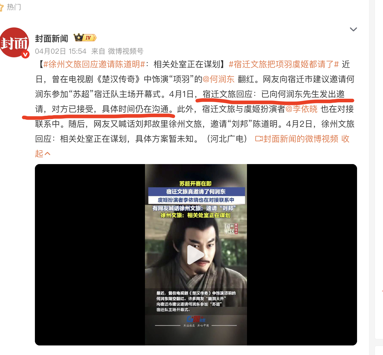 苏超开赛在即,这两则新闻给我笑麻了。一个是苏超开赛在即,宿迁邀请到了项羽扮演者何润东;一个是无锡官方小编回复网友说张凌赫不会来苏超助阵无锡队。