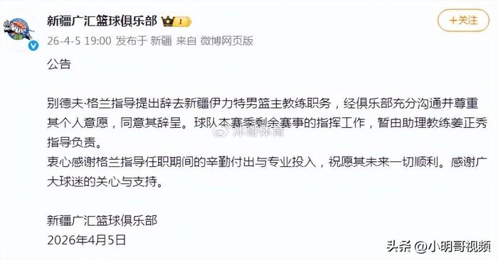 新疆广汇篮球俱乐部官方宣布,主教练格兰(别德夫·格兰)因个人原因提出辞去职务,俱乐部经沟通后尊重其个人意愿,同意其辞呈。