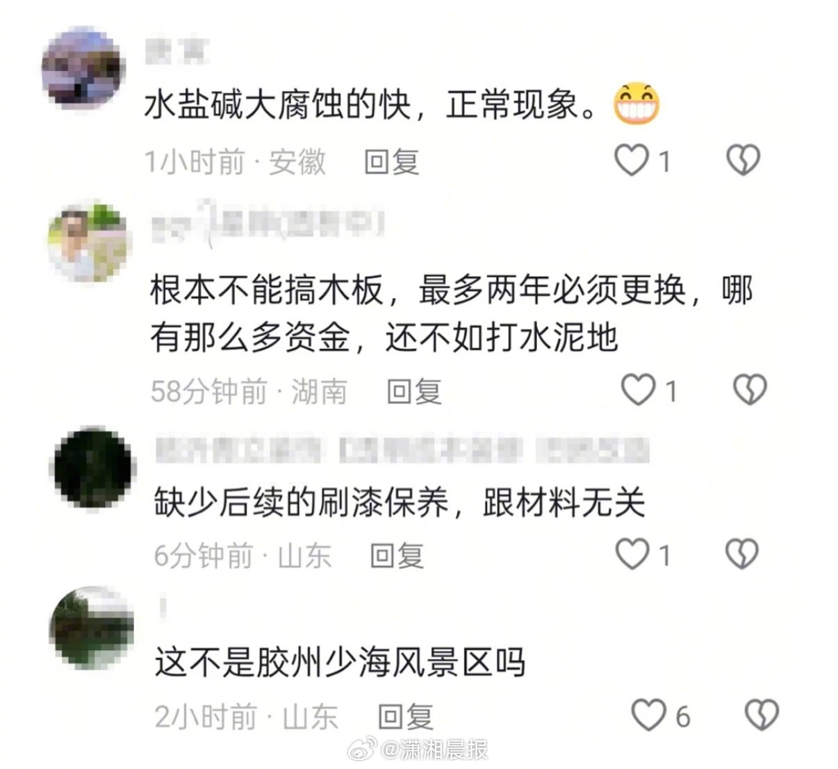 【山东一#滨海平台木板翘起存安全隐患#,#当地回应滨海平台木板翘起#:现场已被围挡无人使用,已派人去现场核实】4月6日,一山东IP网友发视频,画面中一木制平台有不少木板翘起,视频引发热议,网友质疑:“质量安全不过关”“不能用木制材料”“缺乏保养”,也有网友认为,“海水盐分大腐蚀快,属正常现象”。4月7日,·晨视频记者私信视频发布者,截至发稿前暂无回应。评论区多位网友称事发地为山东胶州少海风景区一处滨海区域。同日,记者致电少海风景区,一位工作人员称他们也关注到视频,已派工作人员前往现场了解情况进行核实,如有属实会尽快处理。该工作人员分析,旁边因有地下停车场在施工,周边被圈起来不对外使用已有一两年,才看起来无人管理,正常情况下都有巡查和维修,“木板下面还有水泥,人不至于掉下去。”对于有网友质疑在该区域用木板容易被腐蚀等观点,该工作人员表示,木料经过防水处理,翘起来的原因可能是钉子打过的地方破坏了防水层,时间长造成一定程度破损、变形。潇湘晨报·晨视频记者 史继超 武华康 山东