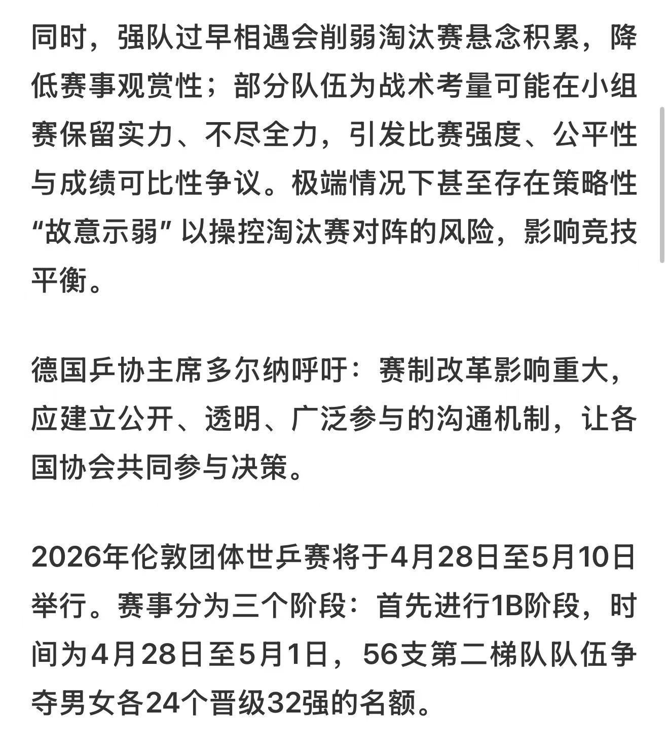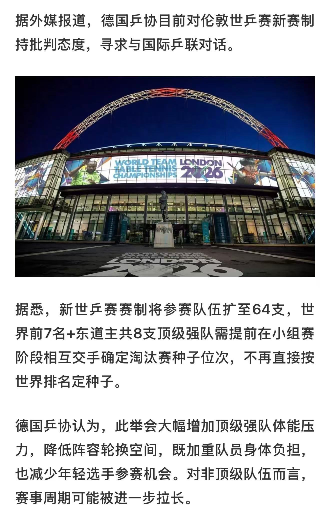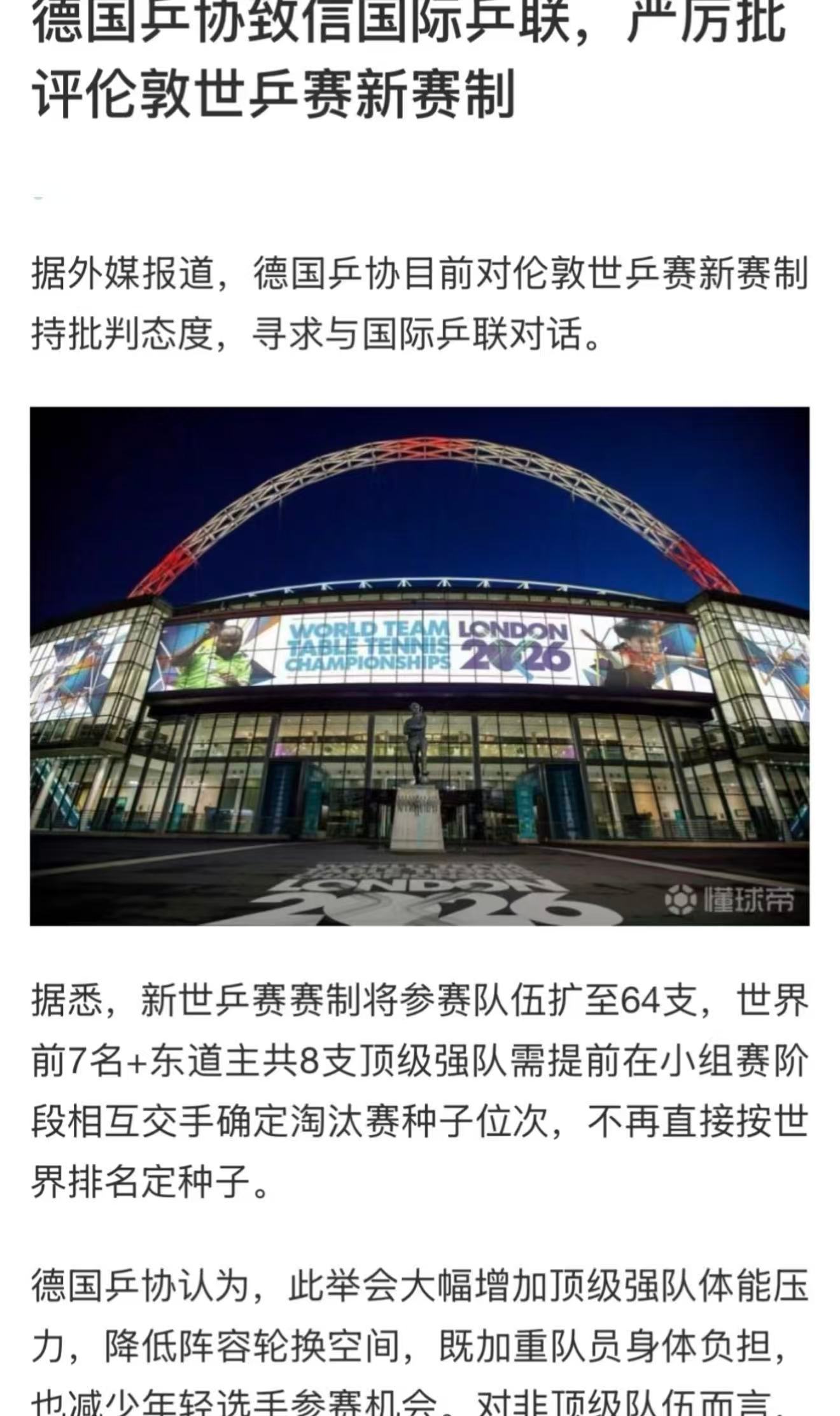 乒乓球德国乒协质疑伦敦世乒赛新规 大家可以看看赛程,强队提前在小组赛就死磕,打完直接进淘汰赛。德国乒协指出,这导致强队在小组赛没退路、必须全力拼,到了淘汰赛反而容易后劲不足,这样的赛制设计确实有点伤身体。
