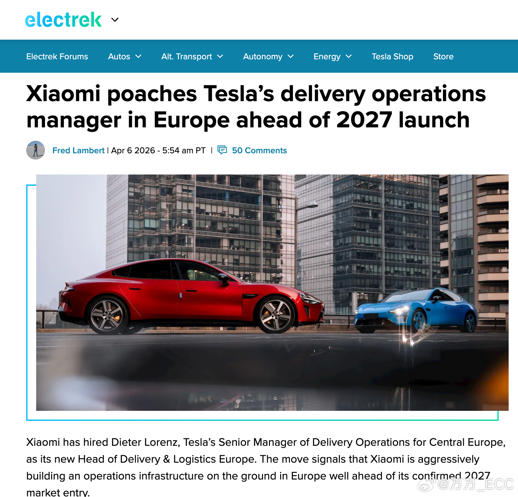 原特斯拉中欧交付运营高级经理迪特・洛伦茨,出任小米汽车欧洲交付与物流负责人。在已确定 2027 年进军欧洲市场的背景下,小米正加紧在当地搭建落地运营基础设施。