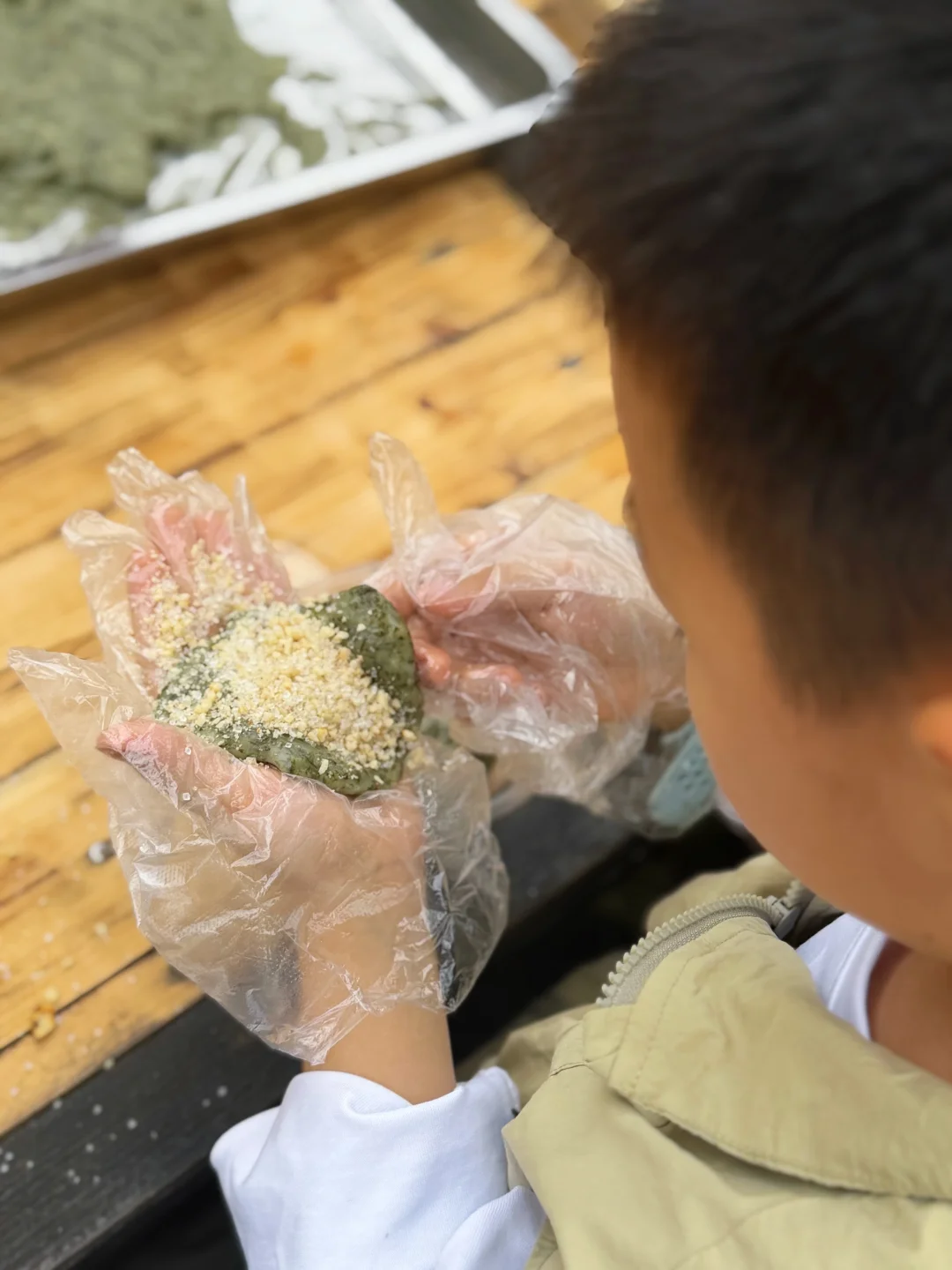 揉面团、搓馅料、包成圆圆的小团子,崽搓得满手绿色,笑得合不拢嘴。蒸出来糯叽叽的,崽一口气吃了两个!