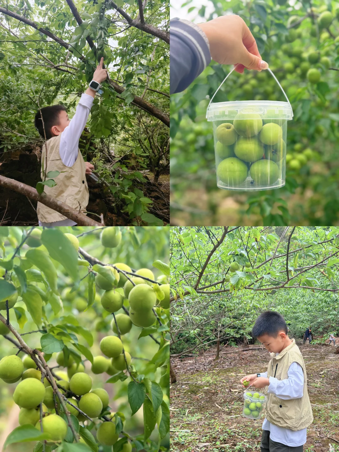 拎着小竹篮冲进梅园,崽摘得可认真了,摘到满满一篮,在老师教学下腌制青梅
