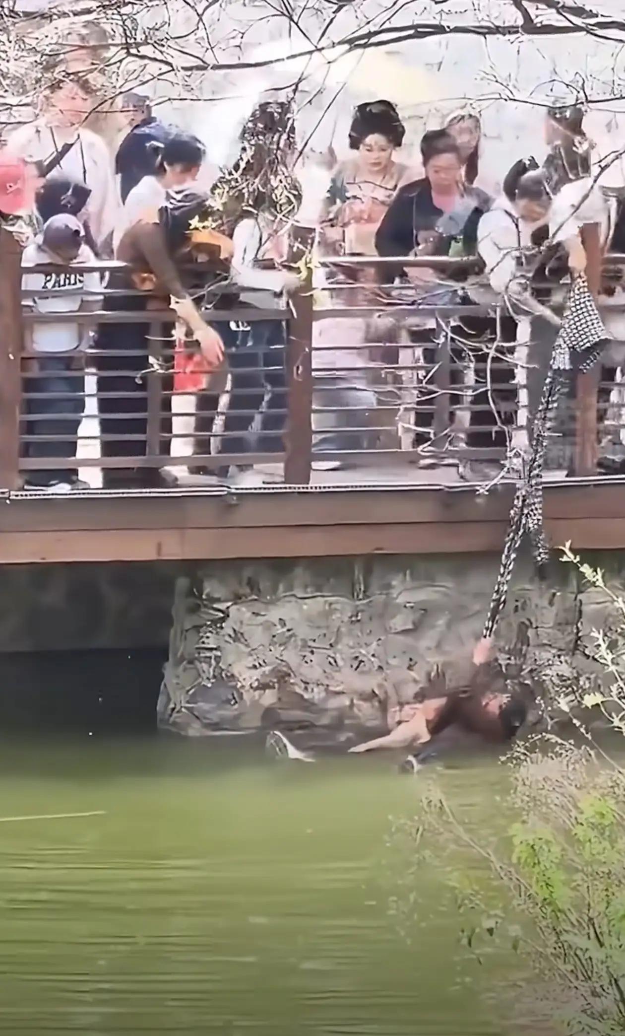 兴庆宫公园暖心一幕:白衣女子用外套当绳,勇救落水母子