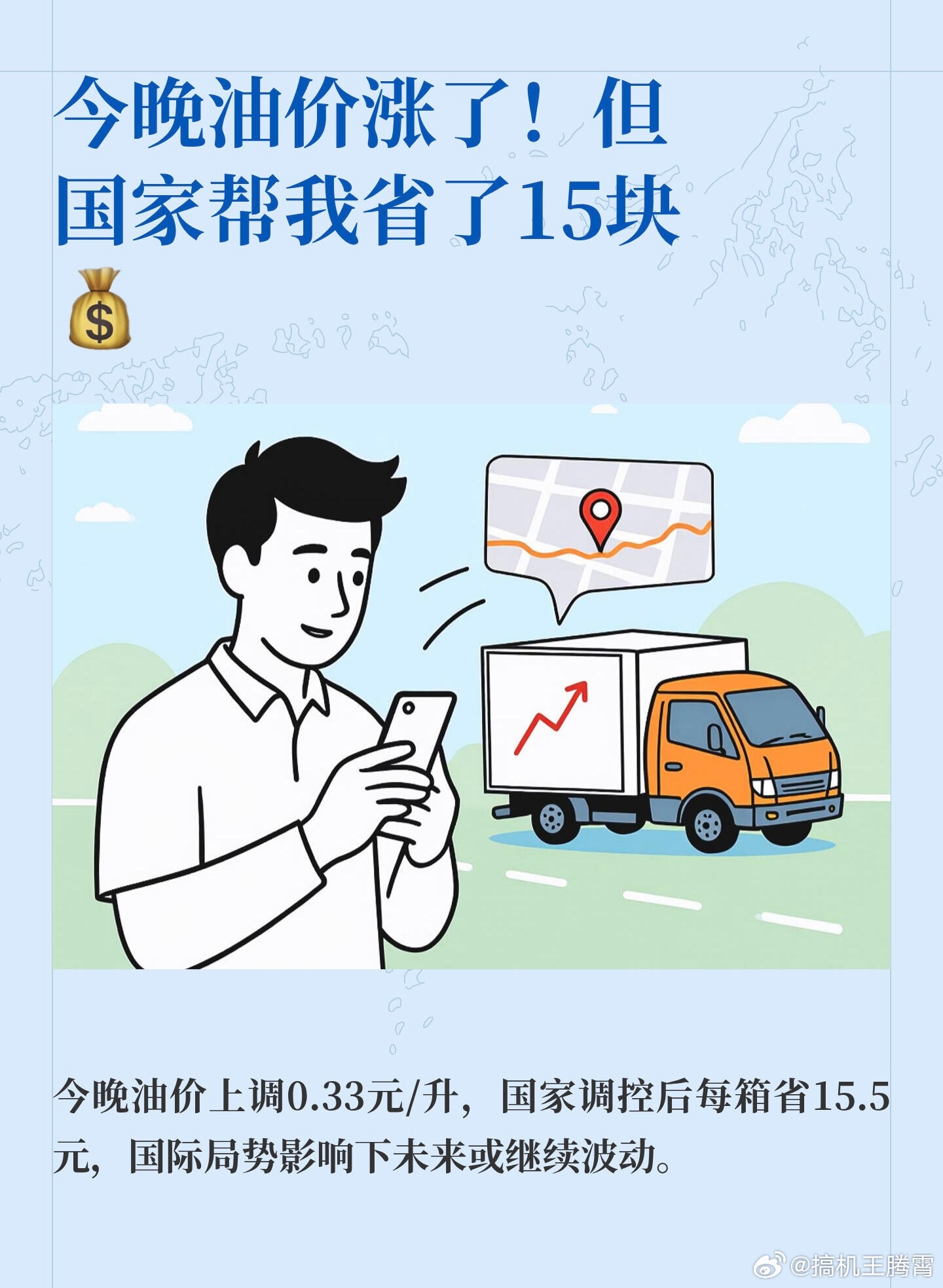 对油车车主来说这是大好事,国家继续出手调控油价今晚0点之后,汽油、柴油价格每吨要涨800元、700元,国家出手调控后实际只涨420元、400元,那么以92号油来说,每升上调0.33元,少涨0.31元,如果加一箱50升油就能省15.5元,多少省点。特别想问问大家,现在有想从油车换成电车的朋友吗?