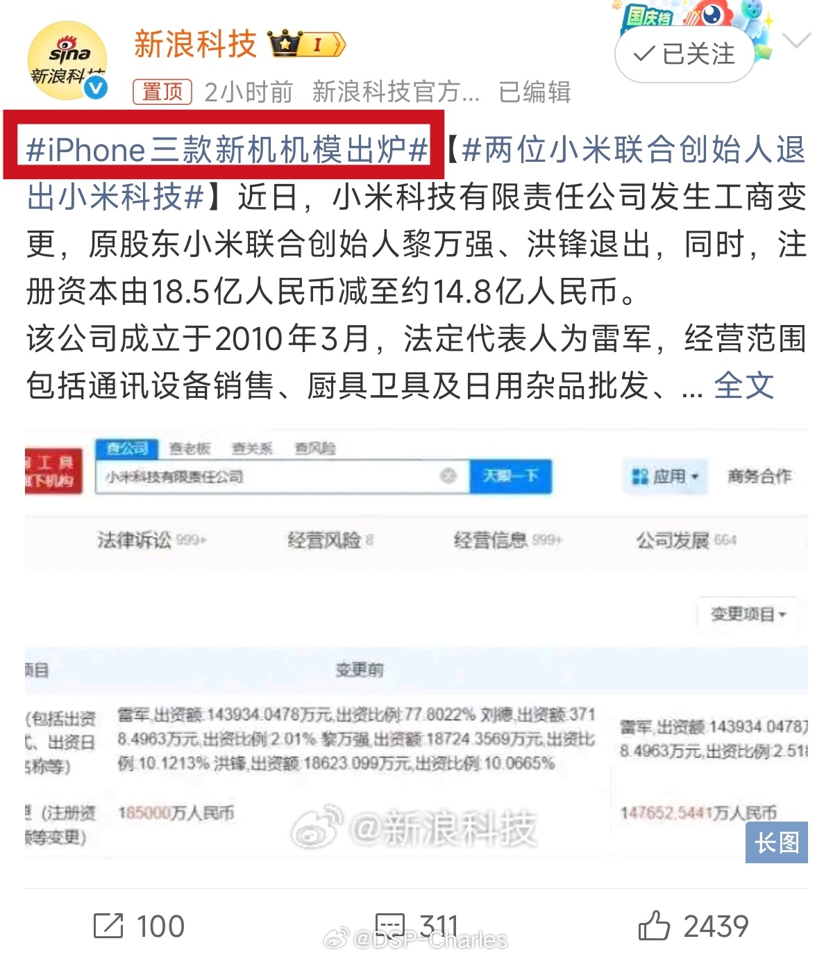 阿黎和洪锋已经实质退休好多年了,跟了公司这么多年,人家也干不动了啊,有什么好大惊小怪的?变更后雷总持股比例反而增加到了97.48%,成为小米科技的最大股东。
