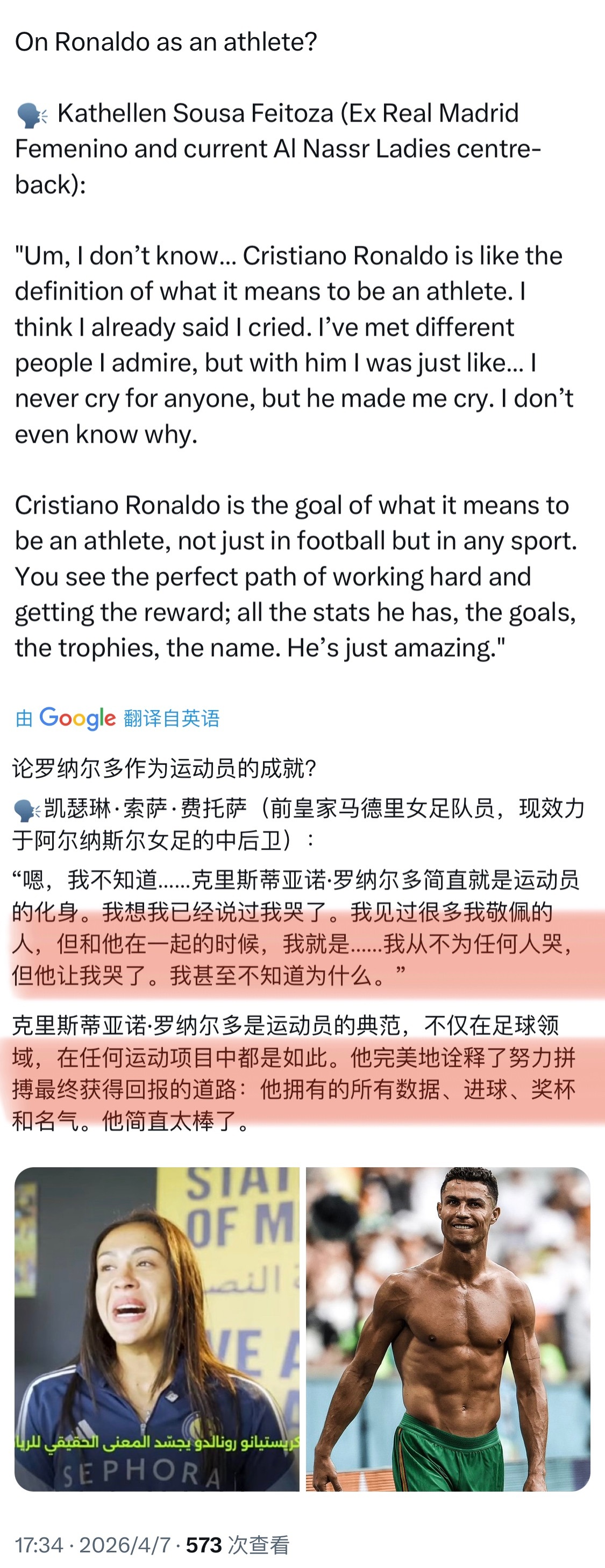 前皇马女足,现胜利女足:“克里斯蒂亚诺·罗纳尔多就是运动员的化身,我从不为任何人哭,但他让我哭了,我甚至不知道为什么。”