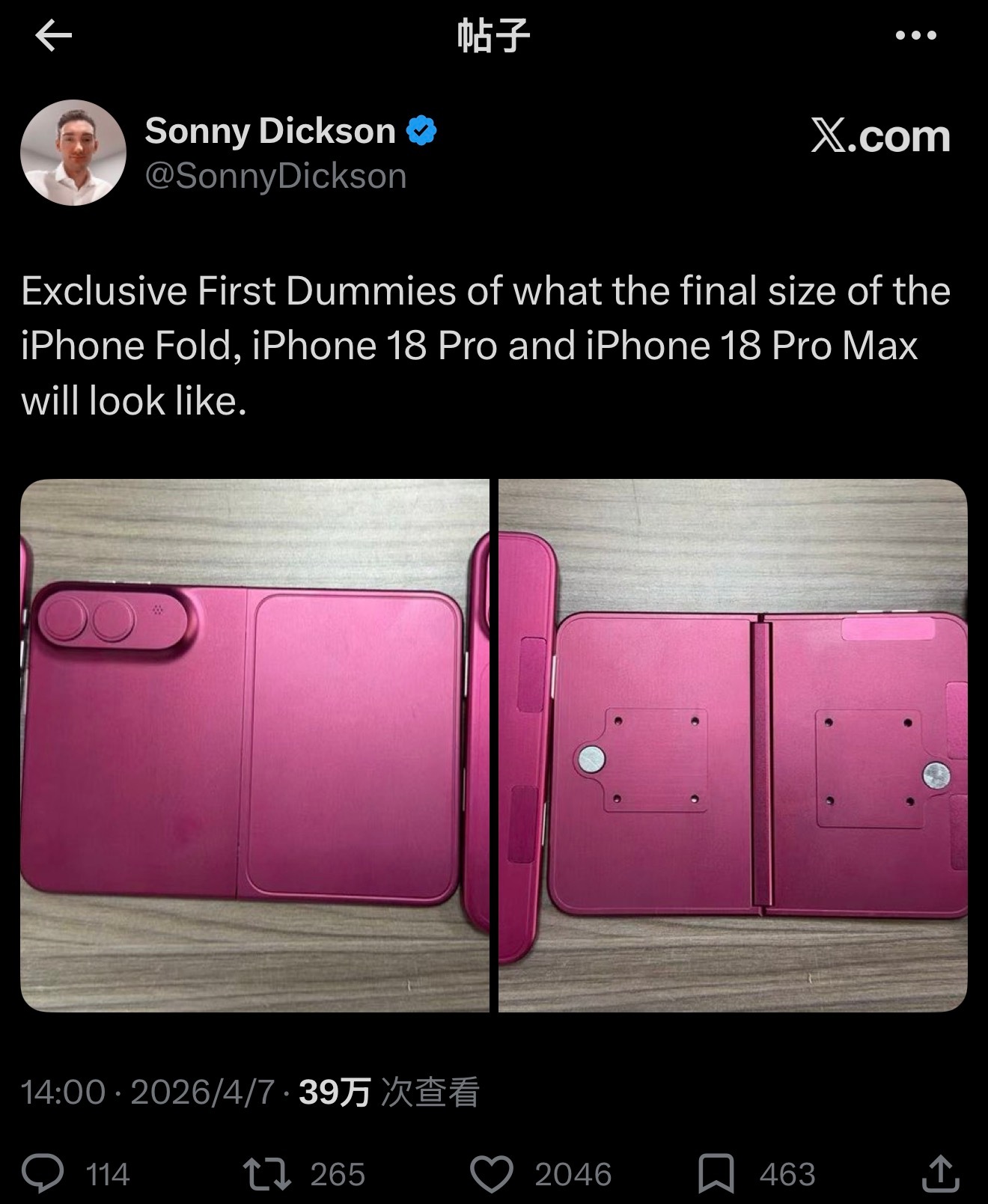 iPhone三款新机机模出炉,iPhone Fold(苹果首款折叠 iPhone)、iPhone 18 Pro、iPhone 18 Pro Max三款机型,这个FoldiOS版华为Pura X啊。。。苹果版阔折叠