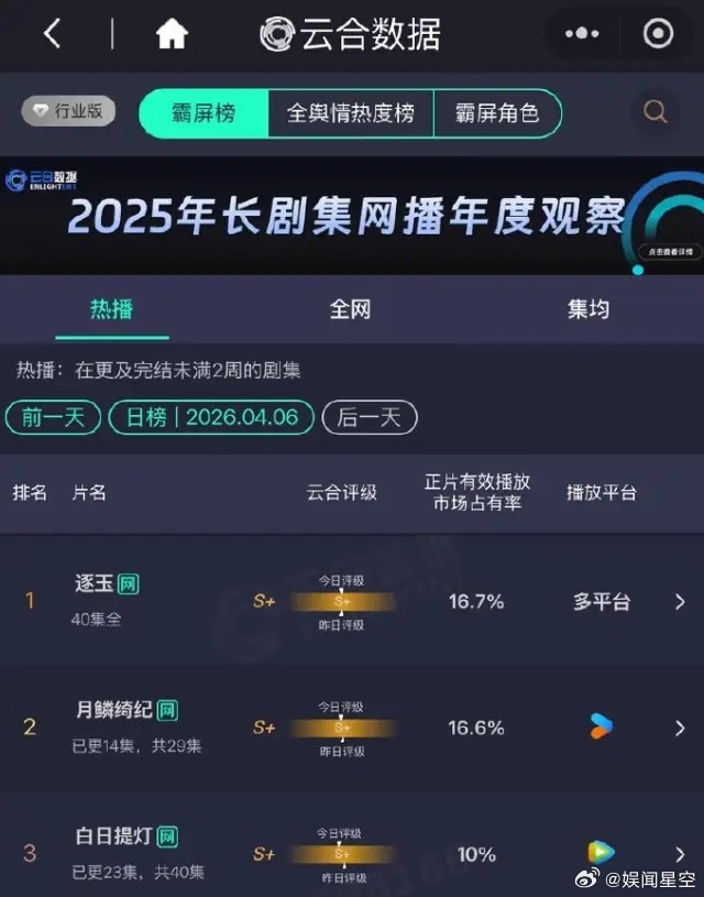 《月鳞绮纪》单更云合下降!《逐玉》又苟了一天,《月鳞绮纪》开始单更,云合占比下降,目前依旧暂列第二,未超《逐玉》,《月鳞绮纪》目前能排在今年第二,日播放量比白鹿《唐宫奇案》走势要好,毕竟这部剧才29集,最终集均有破3000万的趋势,当初官宣的四人平番,但是曾舜晞和陈都灵戏份明显少很多,从40集删到29集,看来他俩戏份删的最多,郭敬明还是太偏爱田嘉瑞了,他和鞠婧祎不搭,曾舜晞和陈都灵挺有CP感的。