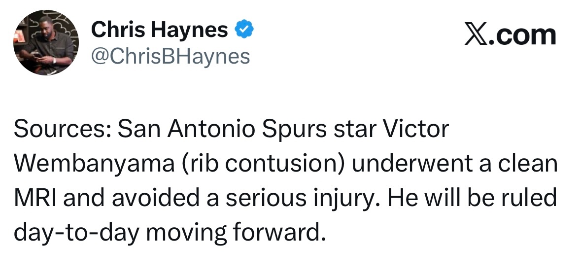 文班核磁共振检查一切正常,进入每日观察。 本赛季还需出场一次(至少20分钟),才