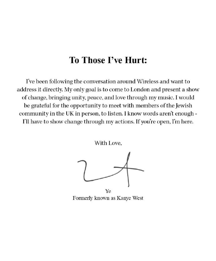 侃爷道歉声明侃爷回应被禁止入境英国 侃爷回应被禁止入境英国,发道歉声明:「致所有我伤害过的人:我一直在关注围绕Wireless音乐节的讨论,希望直接对此作出回应。我唯一的目标是来到伦敦,用一场演出展现我的改变,通过我的音乐传递团结、和平与爱。我非常希望能有机会亲自与英国犹太社区的成员见面、倾听他们的声音。我明白光靠言语是不够的,我必须用行动来证明自己的改变。如果你们愿意,我随时都在。致以爱意Ye(曾用名: Kanye West)」