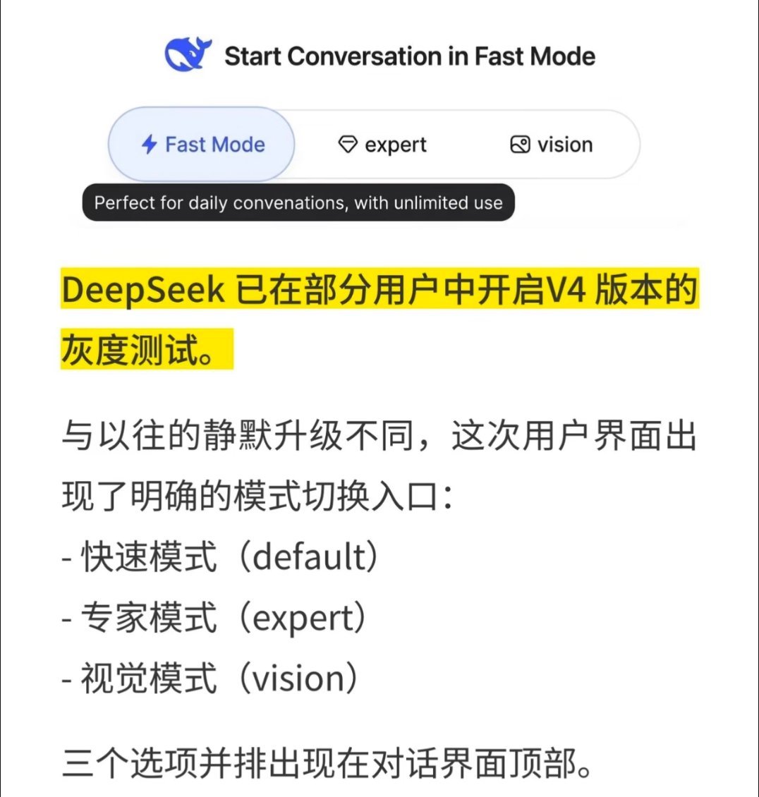 DeepSeek专家模式上线DeepSeek 的官网开始V4版本灰度,部分人可以看到新的界面,区分“快速模型”,“专家模式”,“视觉模式”。可是我更新到最新版本也没有见“专家模式”,大家有体验过的么?解决复杂问题的能力怎么样…
