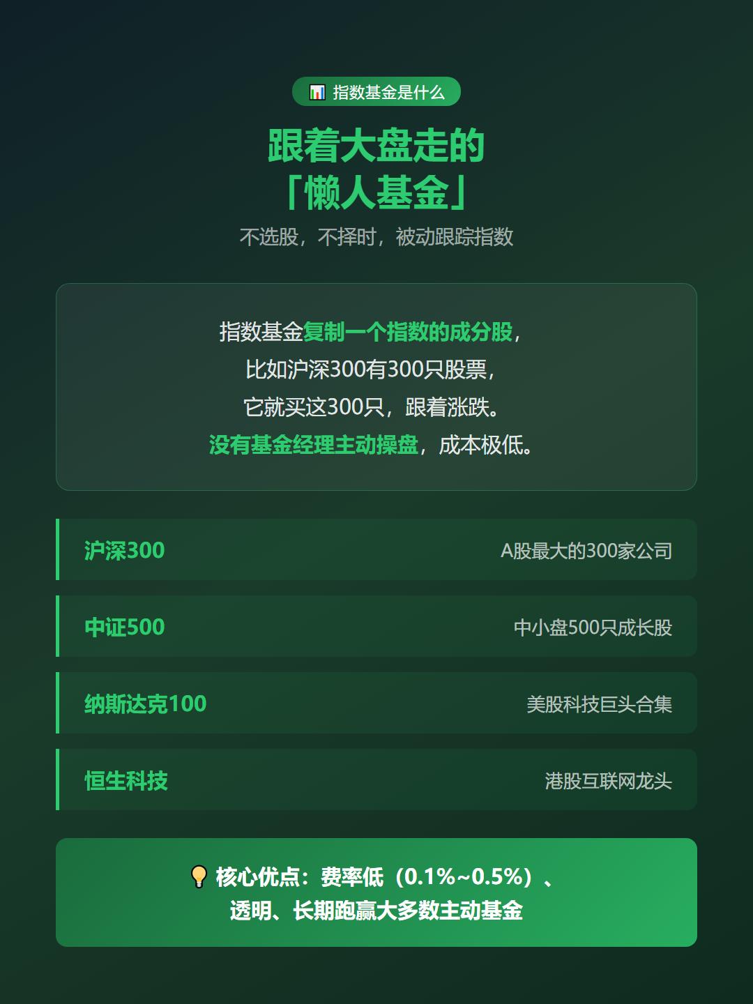 📊 指数基金 = 懒人神器 跟踪指数成分股,比如沪深300、中证500 不挑人,费率低(0.1%起),长期跑赢大多数主动基金 适合不想花时间研究的普通投资者