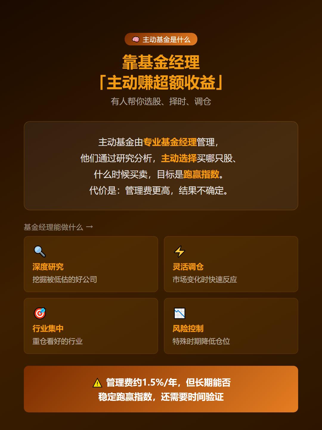 🧠 主动基金 = 找人代劳 基金经理主动选股择时 有机会超越市场,但费率高(1.5%+),强依赖经理能力 长期来看,真正能持续跑赢指数的基金经理凤毛麟角