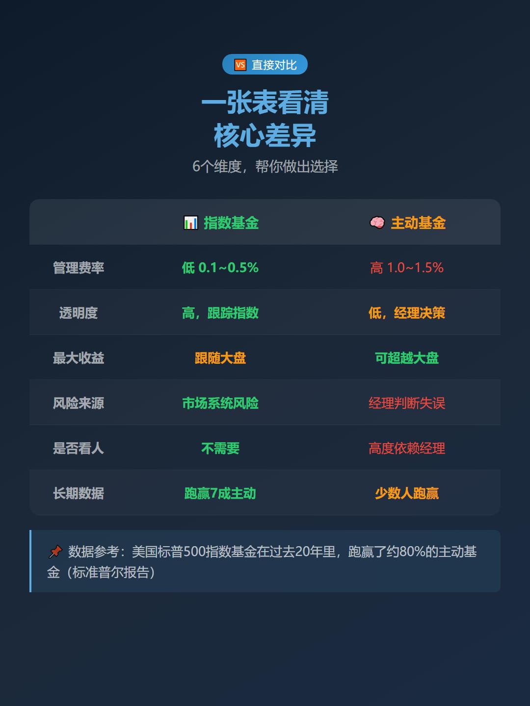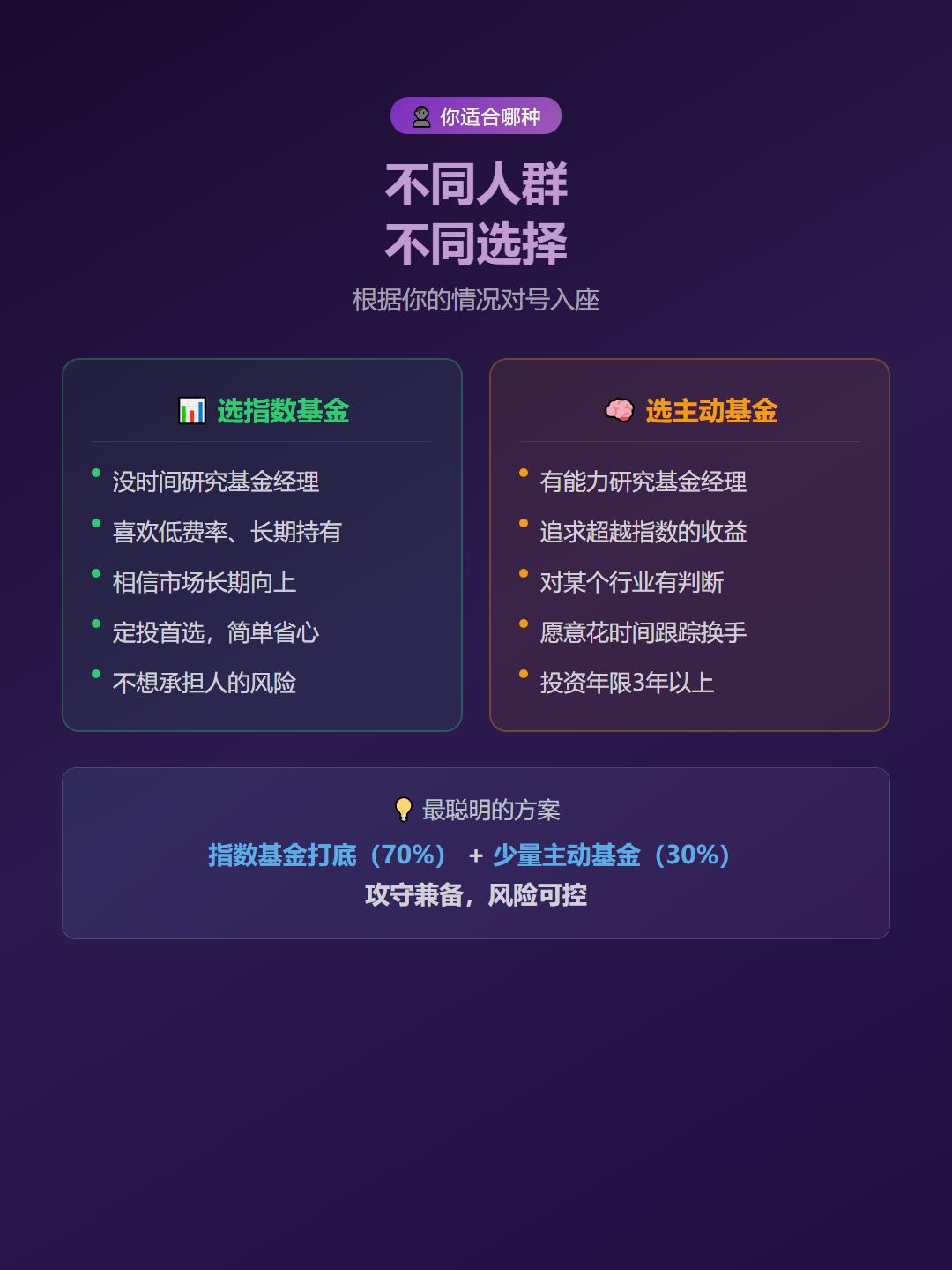 💡 最聪明的配置方案: 指数基金打底(70%)+ 少量主动基金(30%) 攻守兼备,风险可控 数据说话:美股20年数据显示,超80%的主动基金长期跑不赢标普500指数