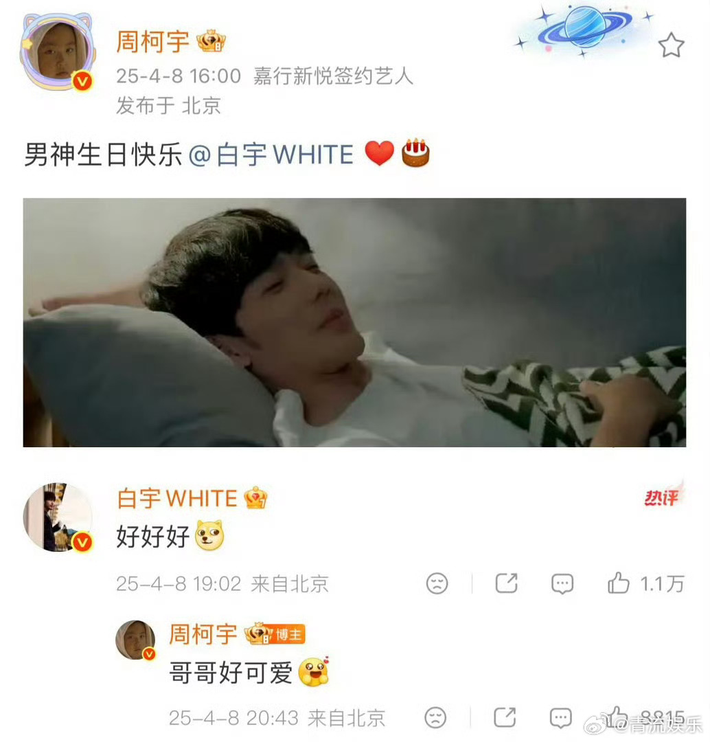 周柯宇发六个爱心给白宇庆生 今天白宇生日周柯宇发了六个爱心为白宇庆生,两位大帅哥