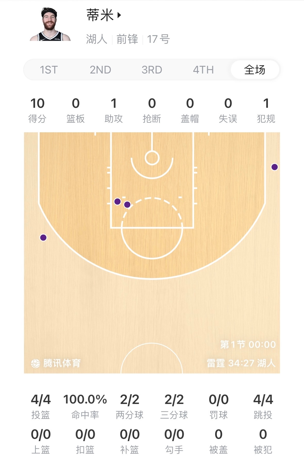 第一节蒂米发挥出色10分,4投4中,三分2中2!