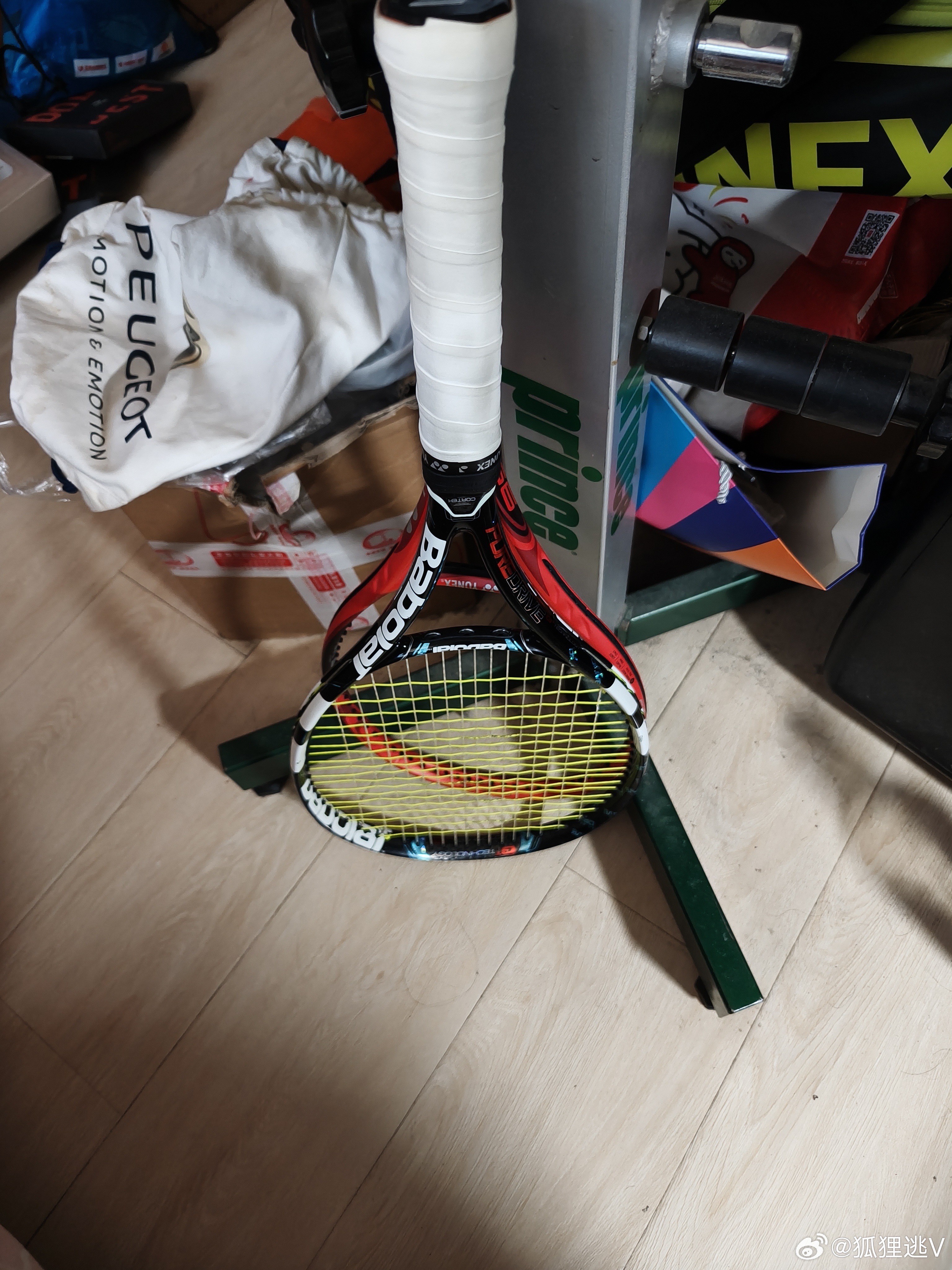 幸亏一早起来就给陆大夫把拍子穿好了,竖线百宝力VS Touch羊肠线55磅+10%预拉,横线尤尼克斯聚酯线PTP(黄)52磅没预拉。