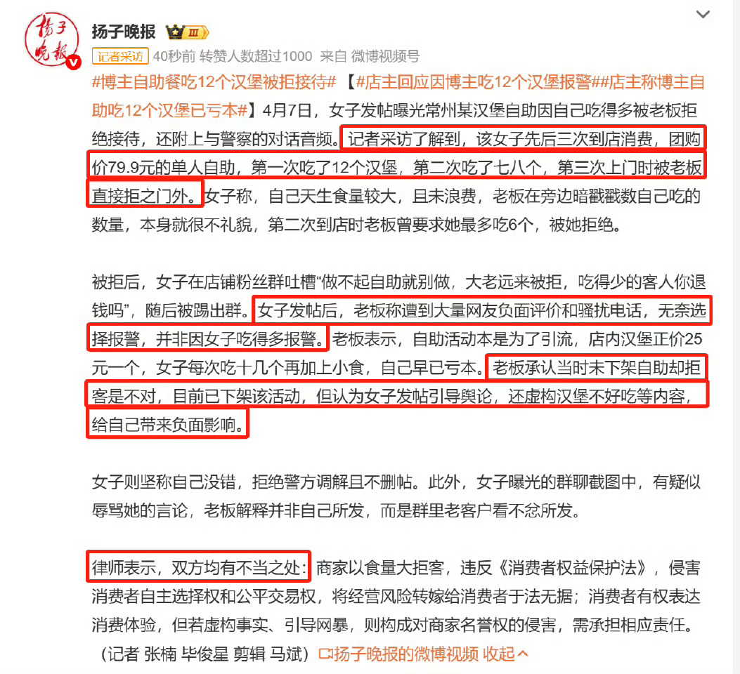 店主回应因博主吃12个汉堡报警既然是自助餐,只要不浪费人家吃几个也让人家吃吧,而