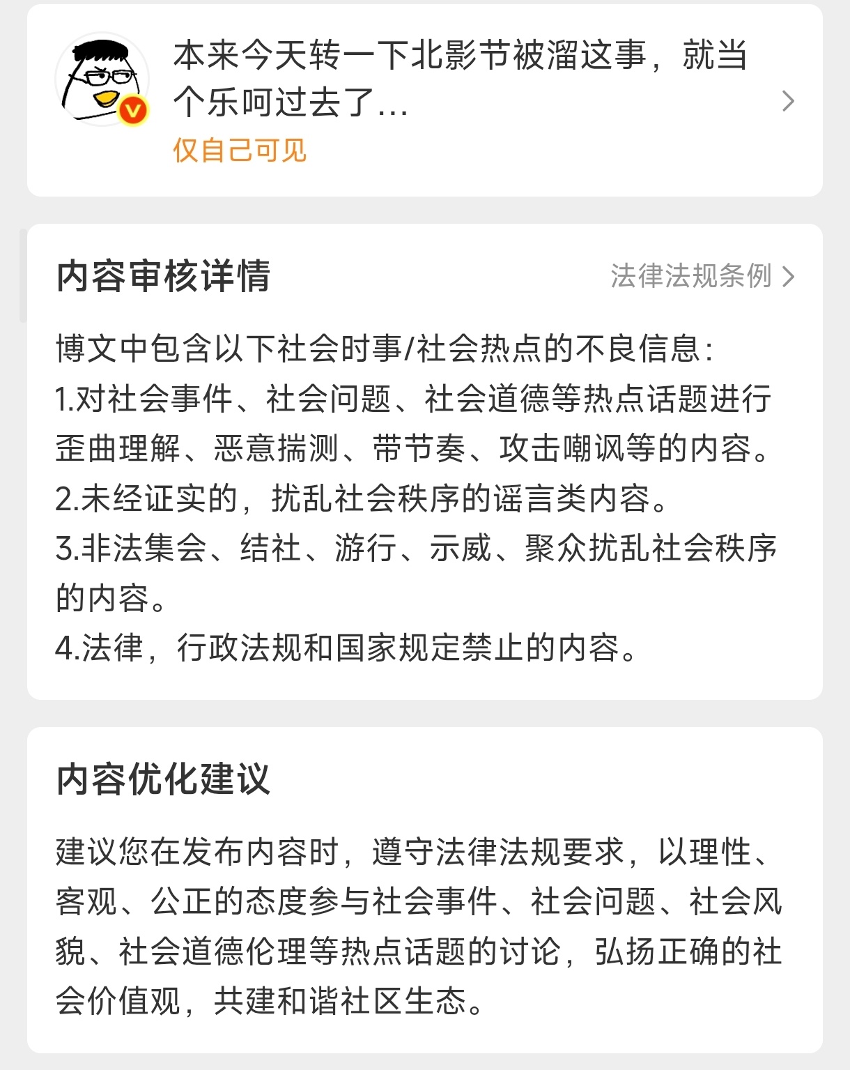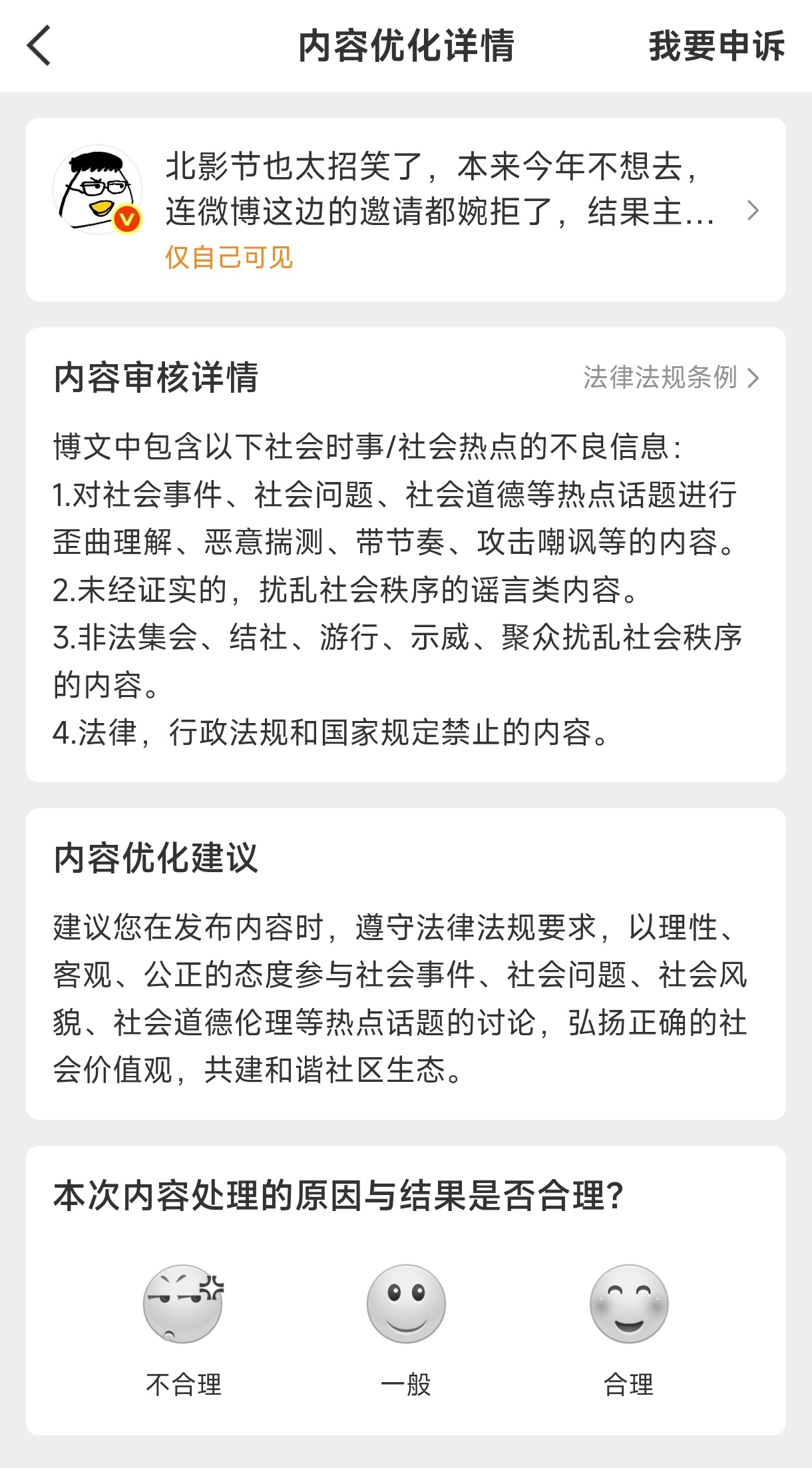 我诚恳谦卑地请教一下我这两条微博具体包含了哪些不良信息呢?1、我这点小事扯不上社会事件。2、我发的都是亲身经历的事实,有通话记录和录音。3、更扯不上。4、难道我犯法了?请明示