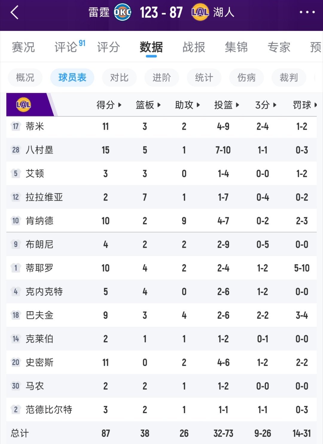 湖人87-123惨败雷霆,吞下3连败。有什么想说?八村垒15分,蒂米11分,肯纳