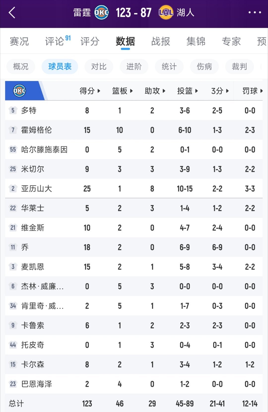 湖人87-123惨败雷霆,吞下3连败。有什么想说?