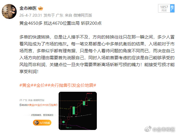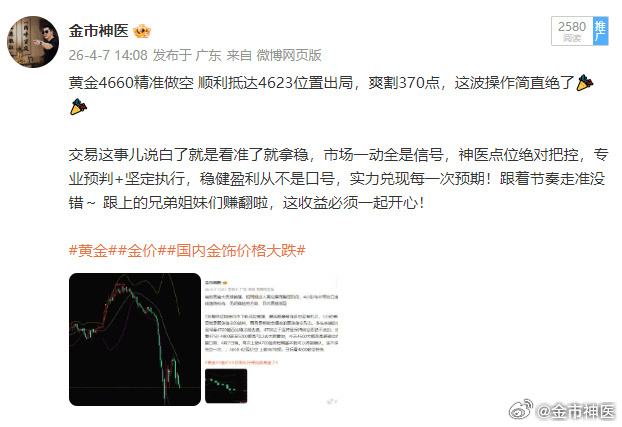 昨天周二短线了结三单 轻松盈利,轻松交易。神医一直强调的是,市场变化莫测,多空来回跑,不管是低点还是高点,看着是机会,其实坑也不少。做黄金想挣钱,说白了就是一直做对的事,点位选准、时间踩对,这单基本就成了。我们做黄金,说白了就是在实战里找盘感,越做越懂市场的脾气,对行情的把握,全是一次次真金白银练出来的。