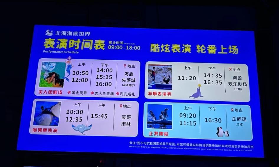 带娃来北海游玩,早上,傍晚不热去海边,中午就去北海海底世界,票价168元,1.1以下免票,真的没想到里面让我们惊喜,表演互动有4场,里面除了海洋动物,还有两栖爬行动物,猴子,孔雀,鹦鹉,天空之镜等,关键是人少,可以随便拍拍拍,我们这次节假日来的,人也不多,跟广州海洋馆差不多票价,但是种类与场地都大很多,值得去。